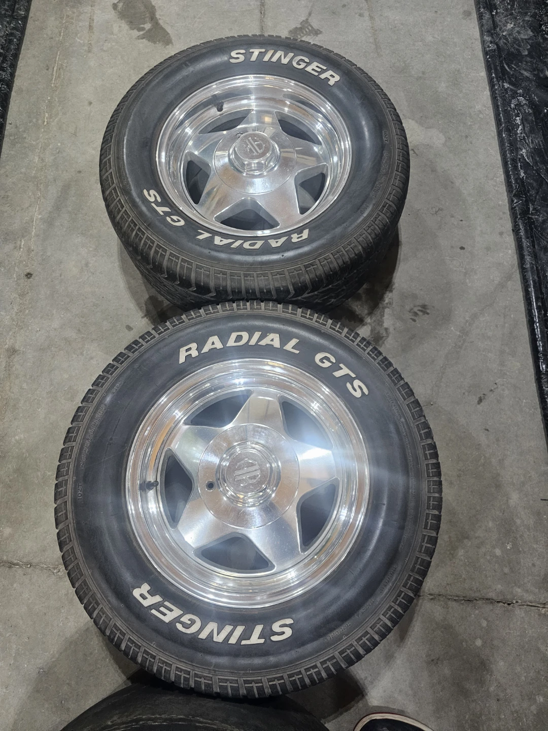 15x8 American racing 4x108/4x114 set of 5 star wheels. Comes with center caps, only missing bolts for them, shouldn't be hard to find replacements. 325 mickeys on the rear, should be replaced, 255s for the fronts, older tires, could maybe be used for a season. Couple rims have a few little nicks. But are in fantastic shape for their age. No cracks or bends.