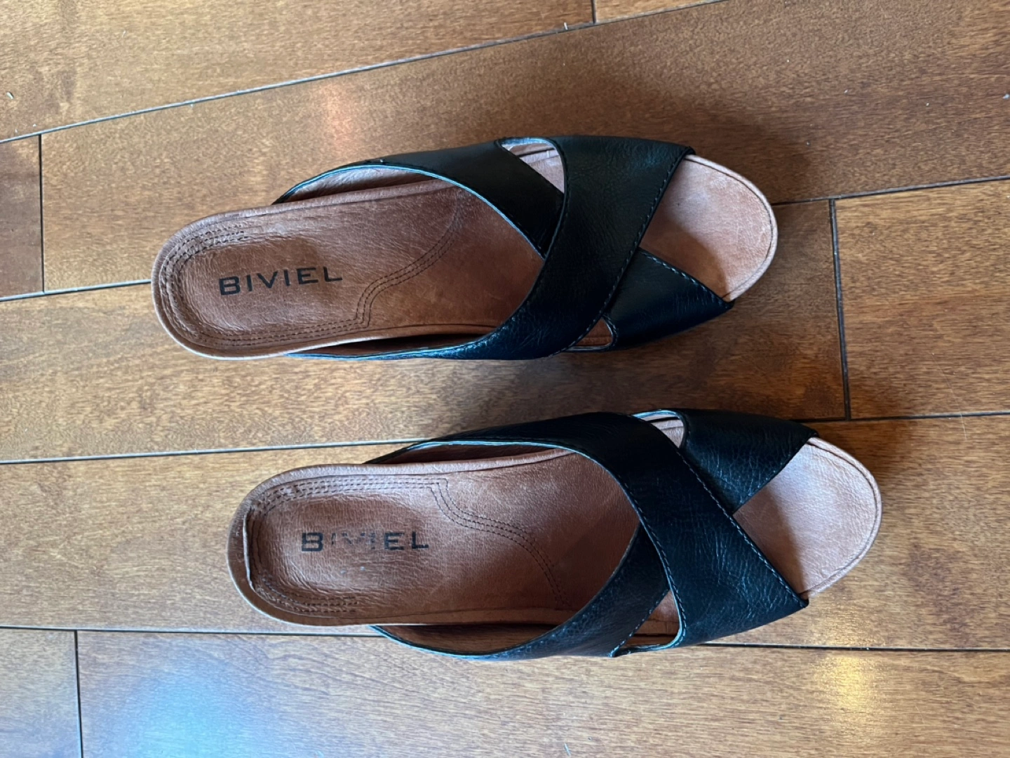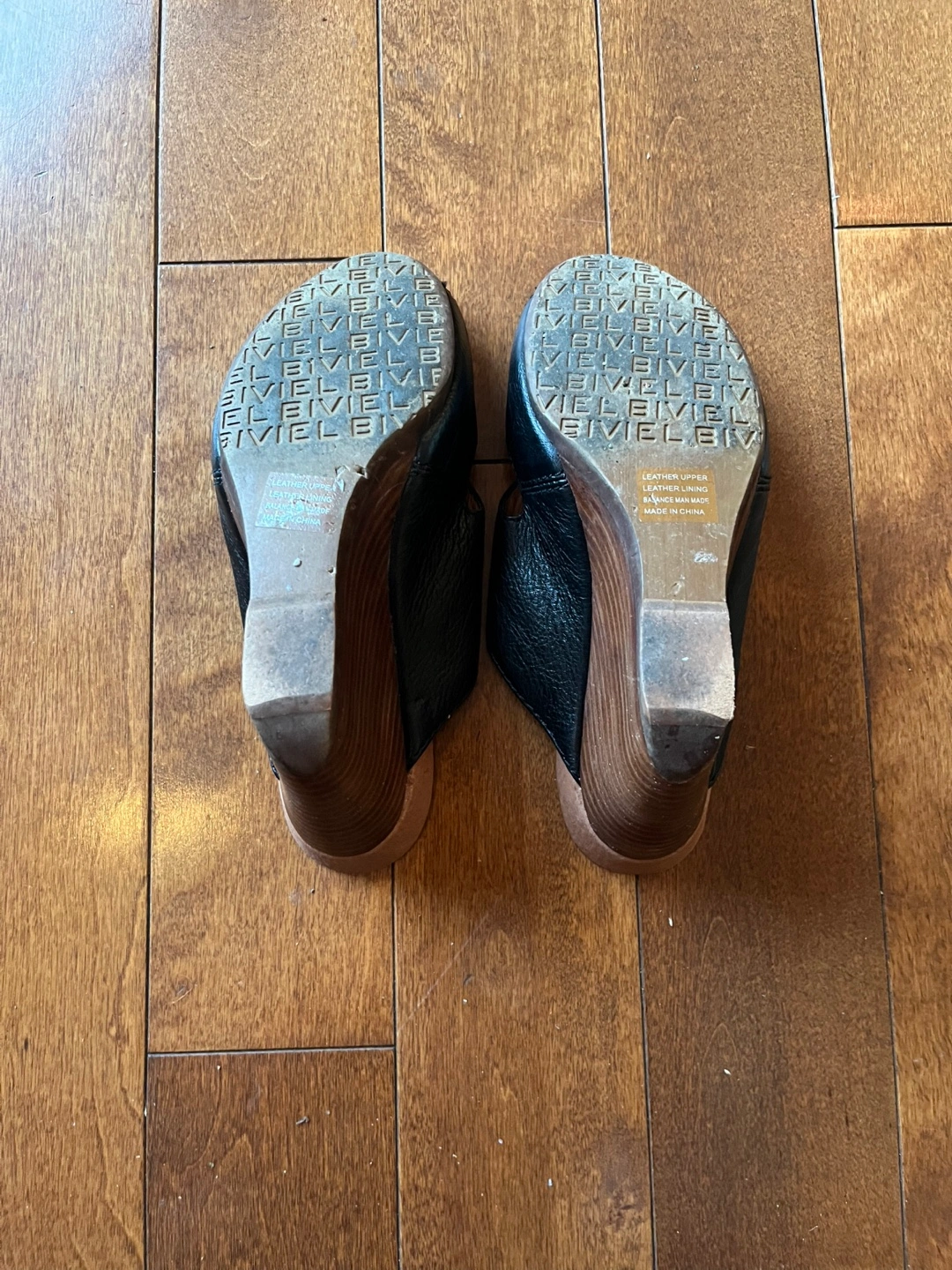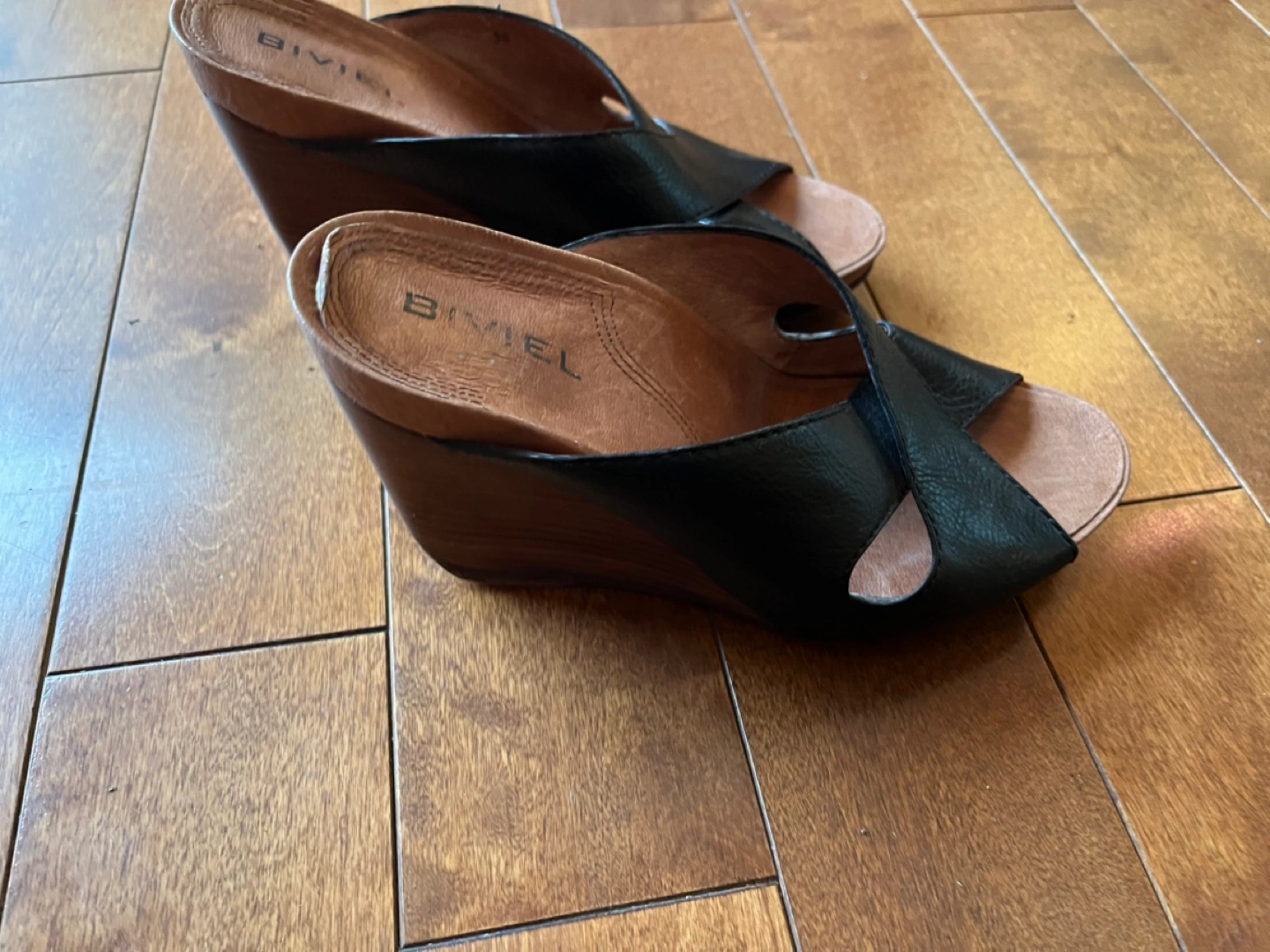 Wedge sandals with a leather upper and a wood wedge. The sandals are black and have a cross strap detail. The sandals have a leather lining and are made in China. Gently used