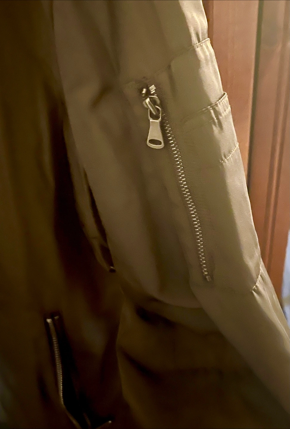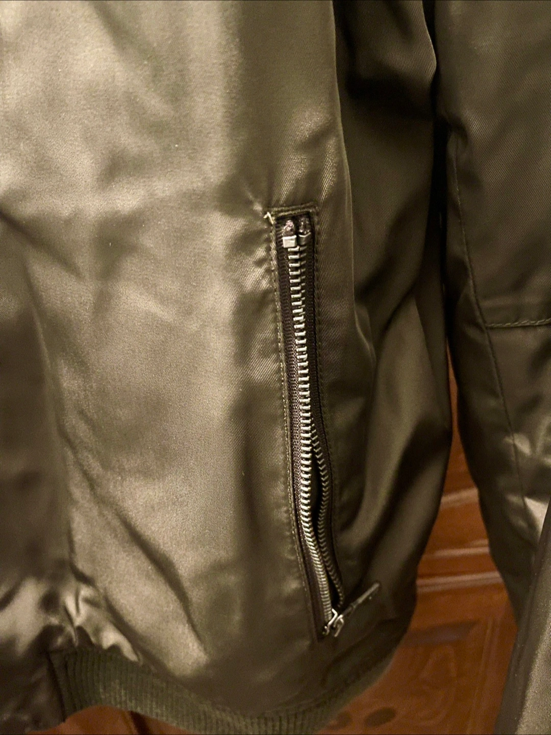 Unisex olive green bomber jacket. Size XL. Full zip closure. Side pockets and sleeve pocket. Ribbed cuffs and hem. Stylish