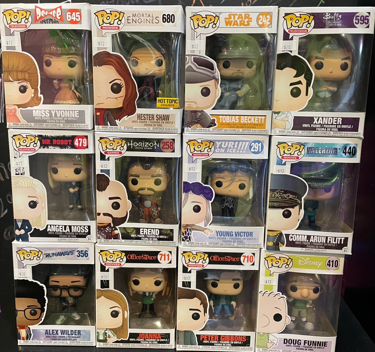 Collection of 12 Funko Pop! vinyl figures. Various characters and shows represented. Includes Miss Yvonne, Hester Shaw, Tobias Beckett, Xander, Angela Moss, Erend, Young Victor, Comm. Arun Filipp, Alex Wilder, Joanna, Peter Gibbons, and Doug Funnie.