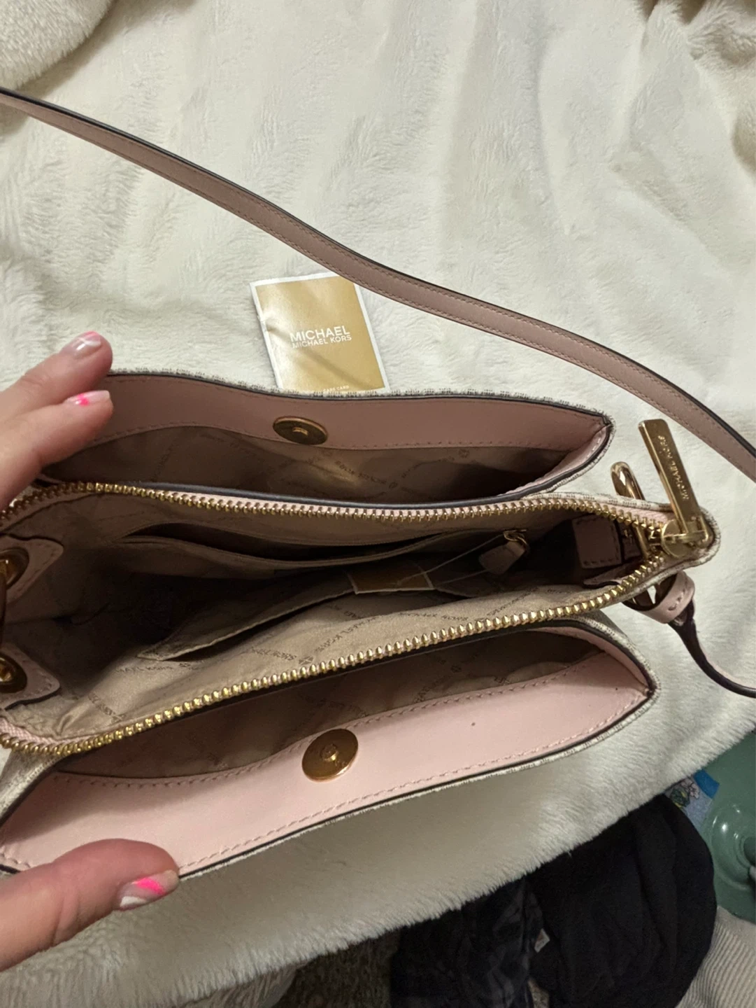 This Michael Kors crossbody bag features the signature MK print in white and grey with light pink leather accents. It has a zip-top closure and an adjustable shoulder strap. Interior pockets offer convenient organization.