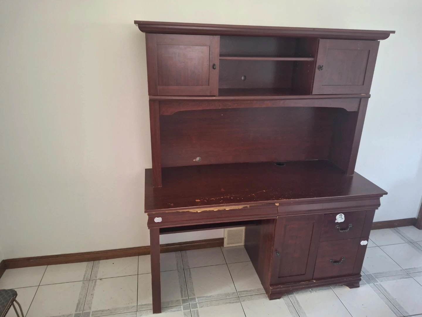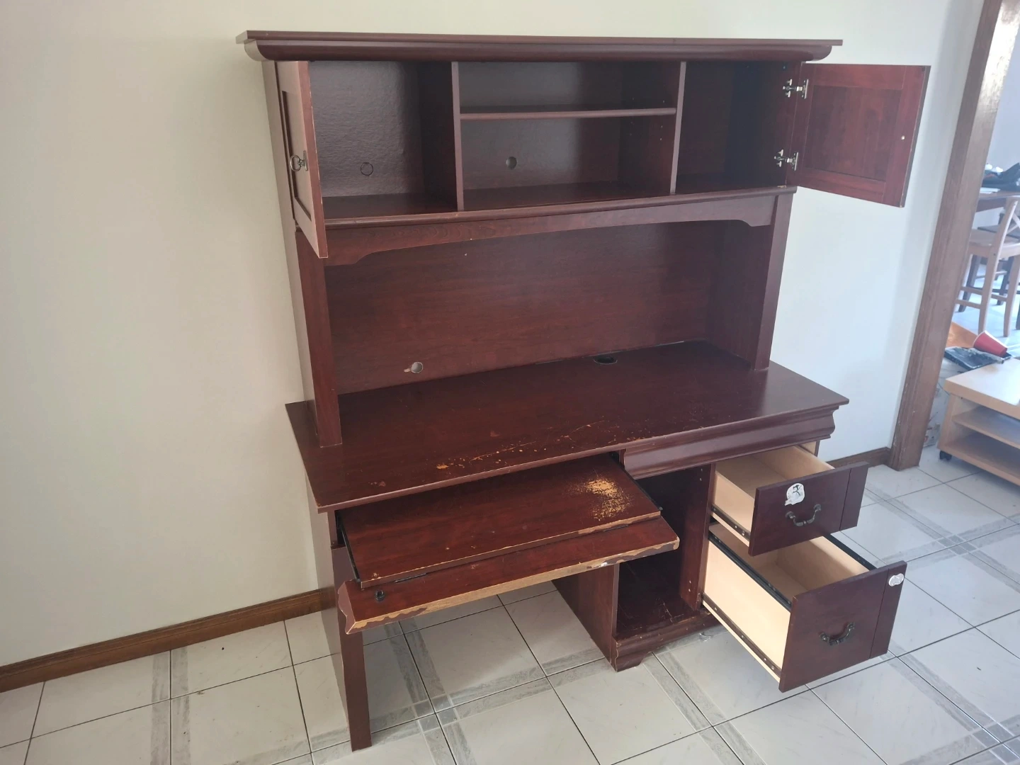 This computer desk has a hutch with shelving and cabinet storage. It features a pull-out keyboard tray and drawers for organizing supplies. It's a sturdy piece for your home office setup!