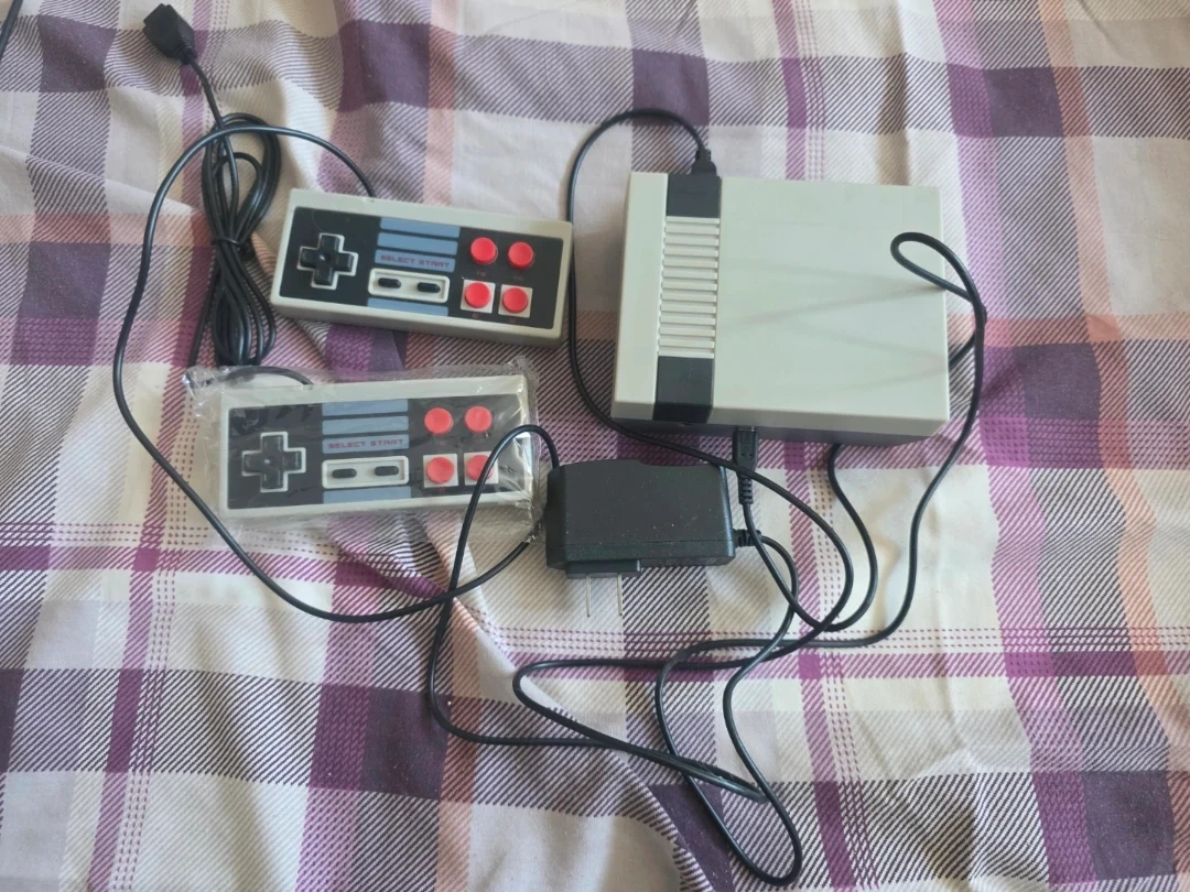 This is a retro mini game console. It comes with two classic-style controllers and a power adapter. Great for reliving favorite classic games!