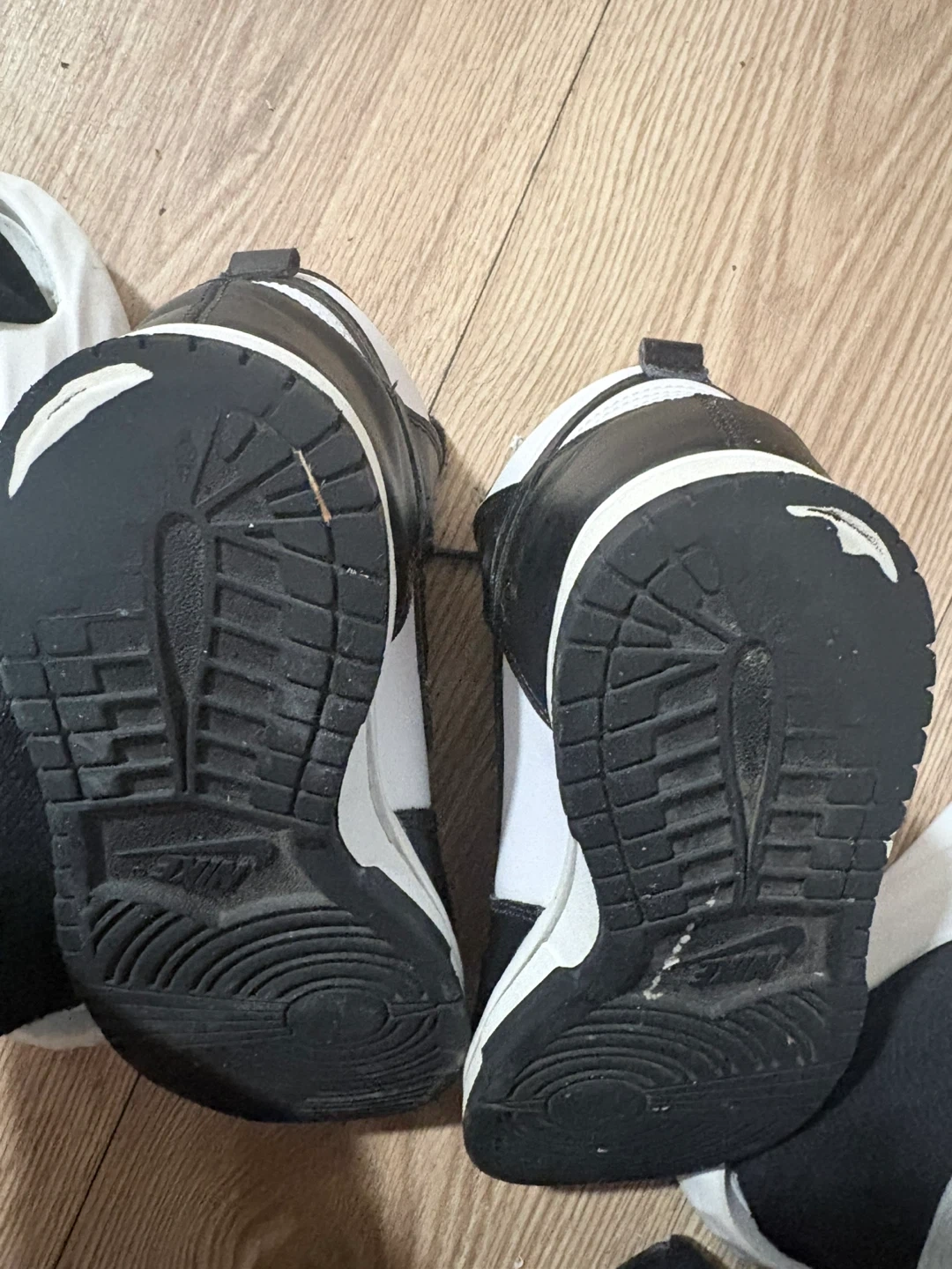 Nike Dunk High Top sneakers in a classic black and white colorway. These shoes feature a durable construction and a timeless design. Leather and synthetic upper for a premium feel. Rubber outsole for traction. Some wear and tear on the bottom small accents.