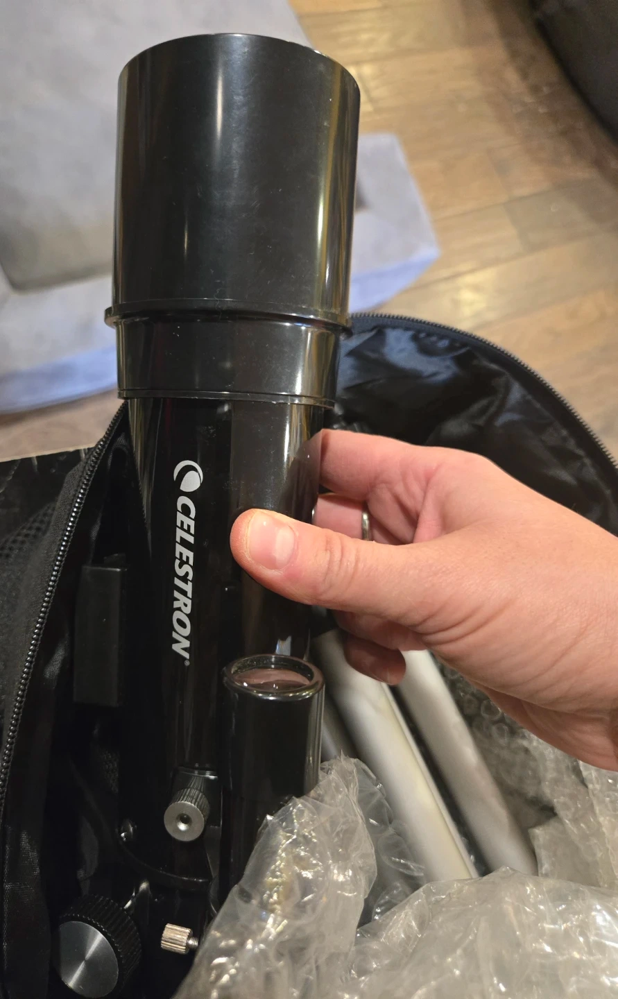 This is a Celestron telescope, complete with a carrying bag and multiple eyepieces (20mm and 8mm) plus a 3x Barlow lens. It's a great starter telescope for viewing the night sky. Comes with a tripod for stable viewing.