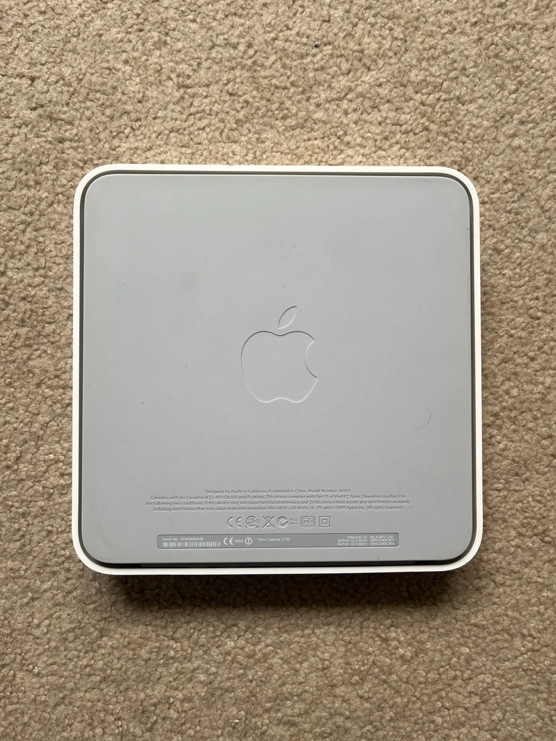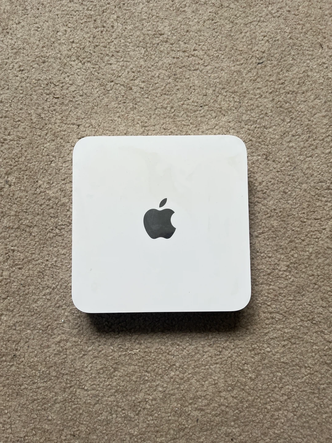 Apple AirPort Extreme Base Station (802.11ac) model A1521. It's white and comes with a power cord and Ethernet cable for 5$ extra. Features include one USB port and three Ethernet ports.