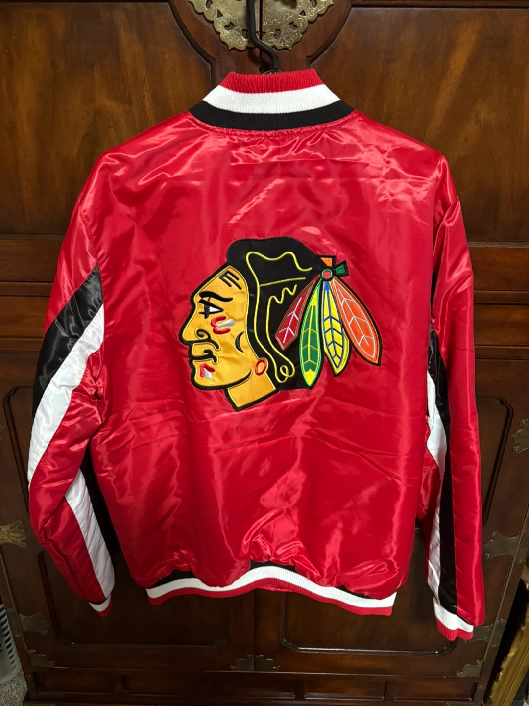Selling a Starter Blackhawks satin jacket in size Large. It's in great condition with the classic Starter logo on the sleeve. Perfect for any Blackhawks fan! Brand new, never worn. No scratch’s on any of the buttons.