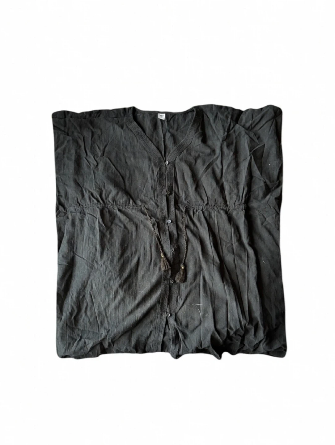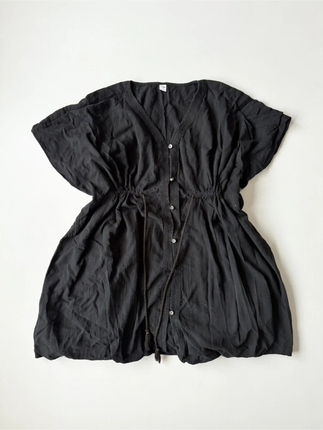 This Old Navy gauze mini dress is a versatile black cover-up. It features a V-neckline with button detailing and a drawstring waist. Perfect for throwing on over swimwear or wearing casually.