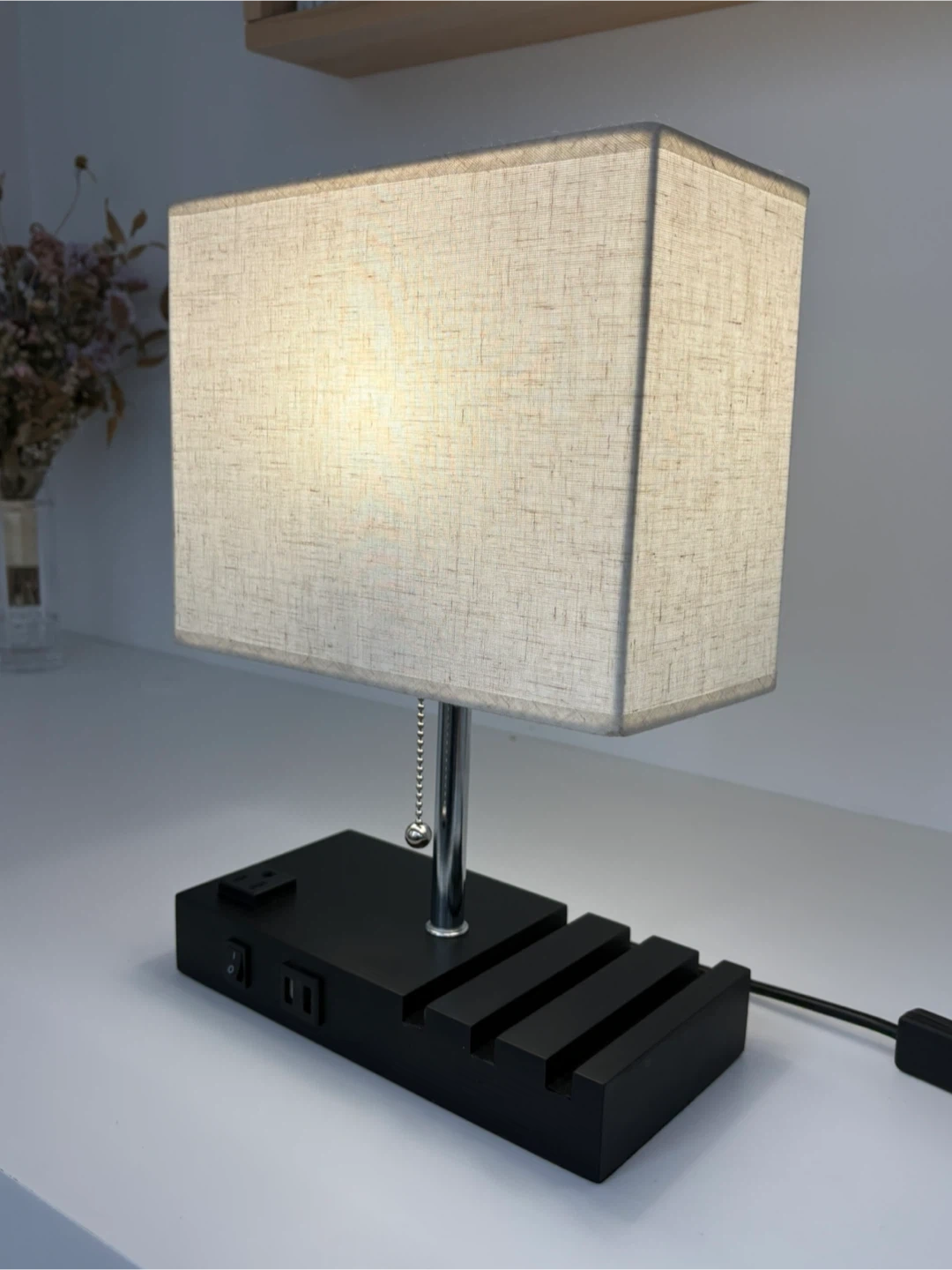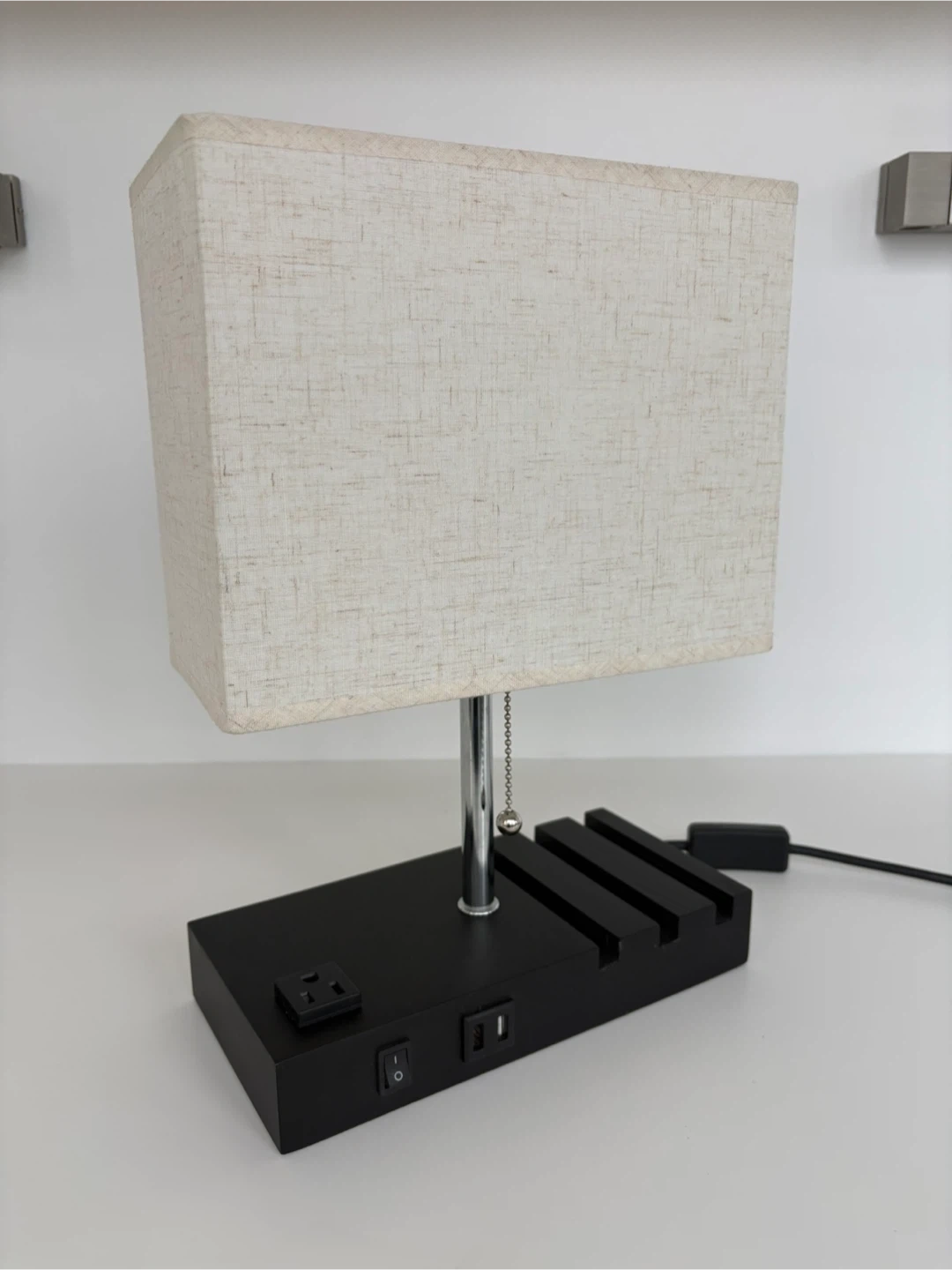 This bedside lamp features a convenient built-in AC outlet and two USB charging ports on its base. It has a pull-chain switch and I’m including the light bulb. I paid over $70 for it, and selling for $30.