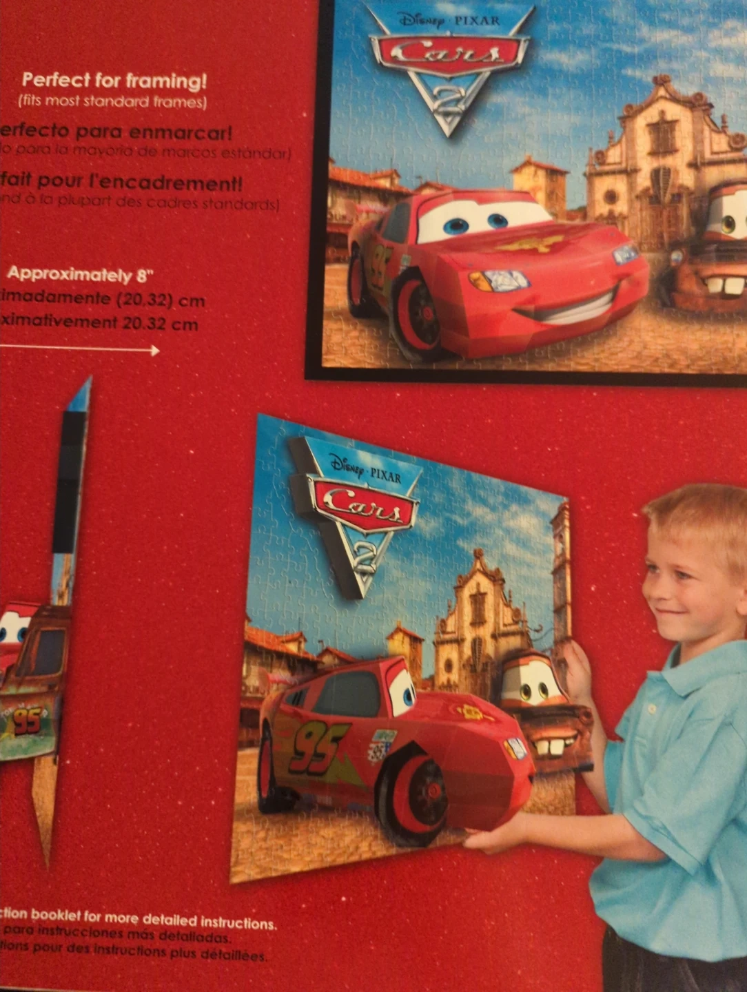 Disney Pixar Cars 2 3D Breakthrough Puzzle with over 250 pieces. It's a moderate to difficult puzzle, recommended for ages 8 and up. The finished puzzle is approximately 18" x 24". Follow simple steps to transform your puzzle into real 3D art!