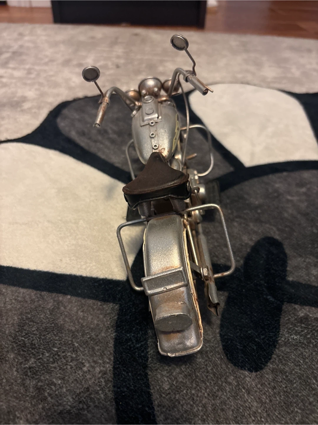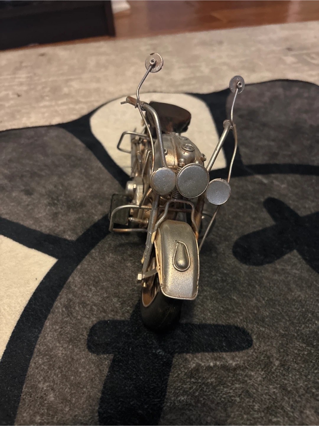 This is a decorative metal model of a motorcycle. It features a silver and cream finish with a brown seat. It's a great piece for display!