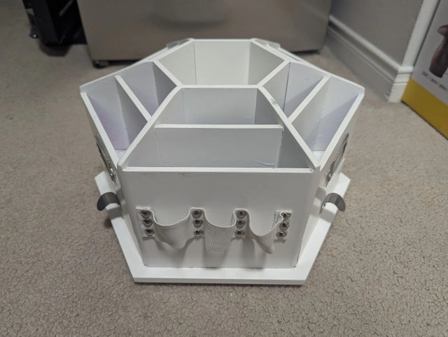 A rotating hobby and craft tool organizer. It's surprisingly large at more than a foot across (14" x 12.25" x 7.5" / 35cm x 31cm x 19cm). It's in good shape, spins well, and all the parts are here, but the elastic is worn out.
