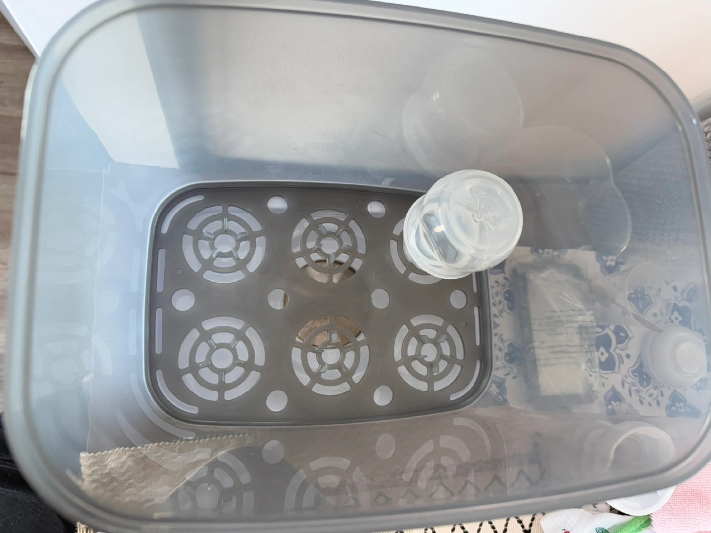 Dr Brown's electric bottle and baby item sterilizer. Grey and white. Multiple settings. Used but in good condition. Only 2 months old