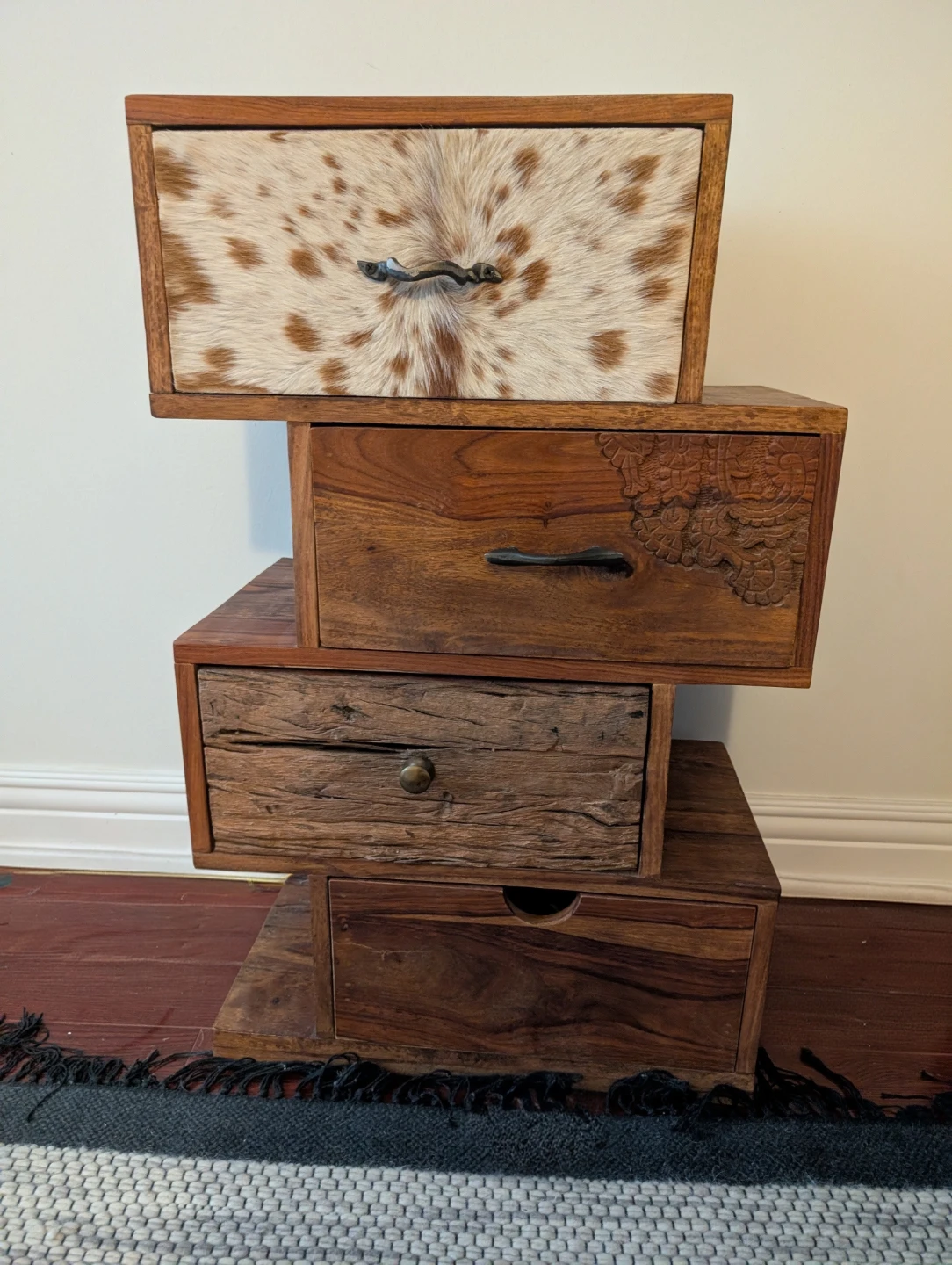 This unique piece is part of the Rodeo collection from KARE Design, from their popular Rodeo Zick Zack (Zig Zag) series. These pieces are known for their "rugged charm," using solid mango wood, genuine cowhide, and hand-carved details.