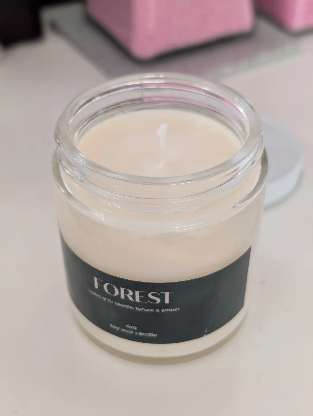 This is a 4oz soy wax candle with a Forest scent. It features notes of fir needle, spruce, and amber. It's housed in a clear glass jar with a white lid.