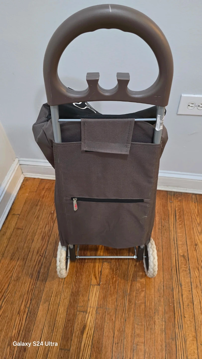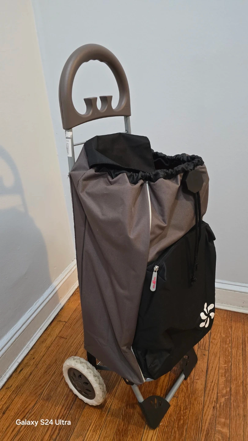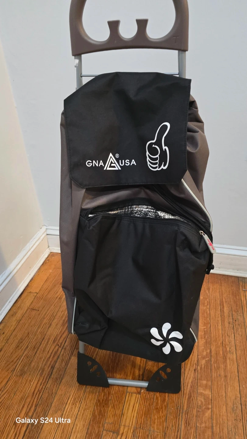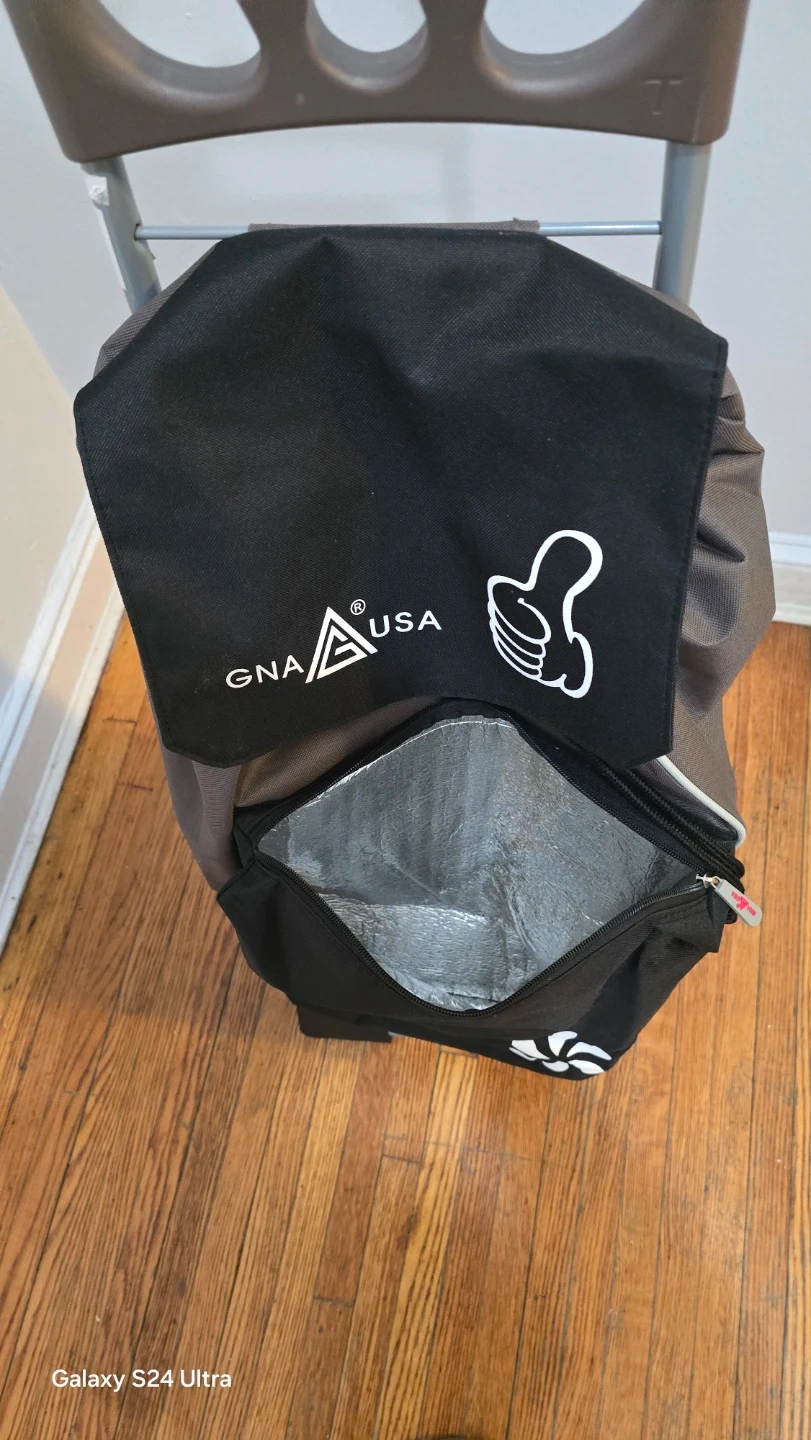 This rolling shopping cart from GNA USA features a durable fabric bag with a drawstring closure and an insulated front pocket. It has a sturdy metal frame and easy-roll wheels for convenient transport. This cart is great for groceries or laundry!