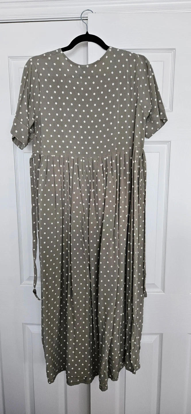 This maternity dress is a grey polka dot dress. Short sleeves and a gathered waist. Size XL but fits more like LG. Has a pocket on the right side.