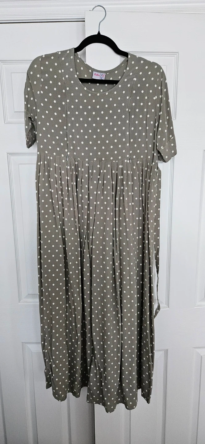This maternity dress is a grey polka dot dress. Short sleeves and a gathered waist. Size XL but fits more like LG. Has a pocket on the right side.