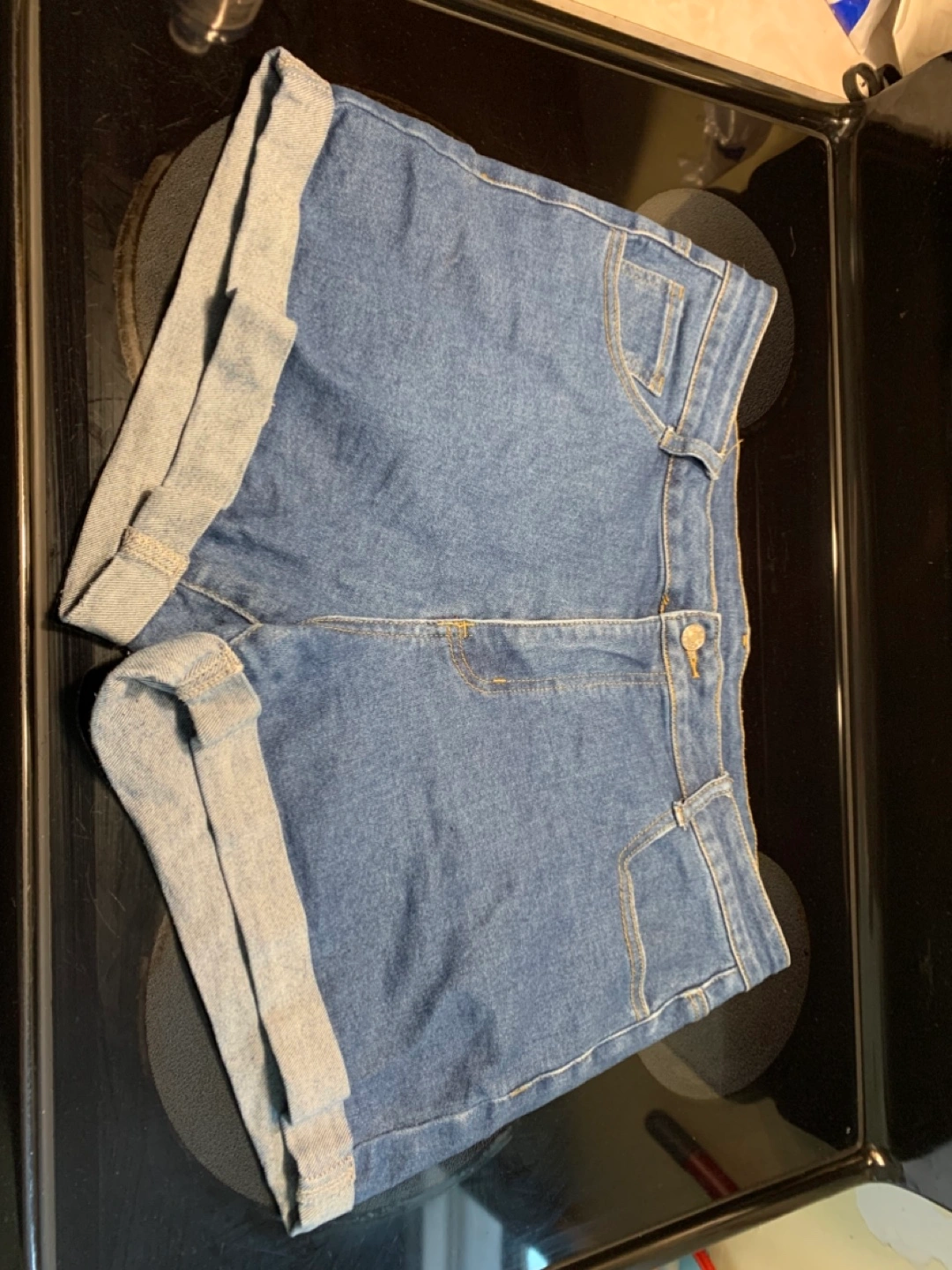 High-waisted denim shorts. Rolled cuffs. Size XXL. Fits more like a L/XL Made in China. 74% Cotton, 24% Rayon, 2% Spandex.reason for selling is hardly used and went to put on this year and they sadly don’t fit.