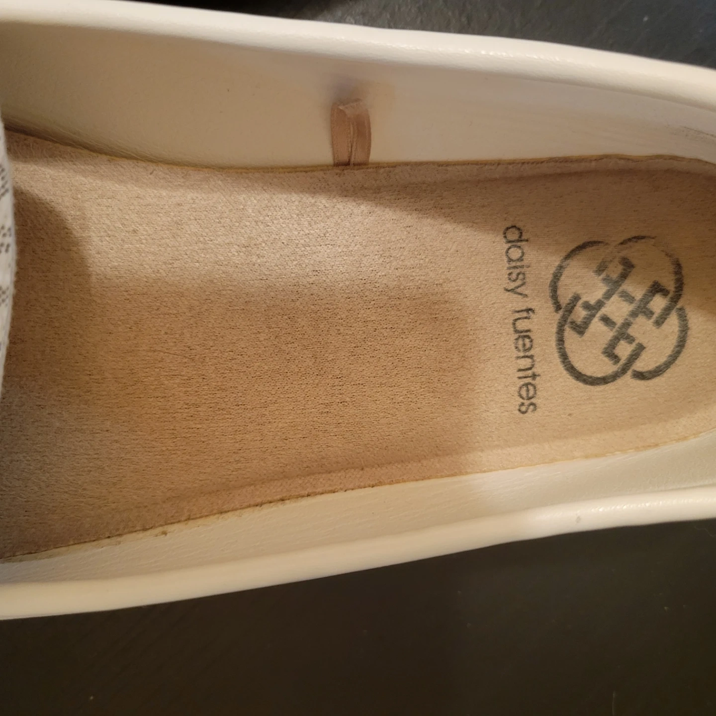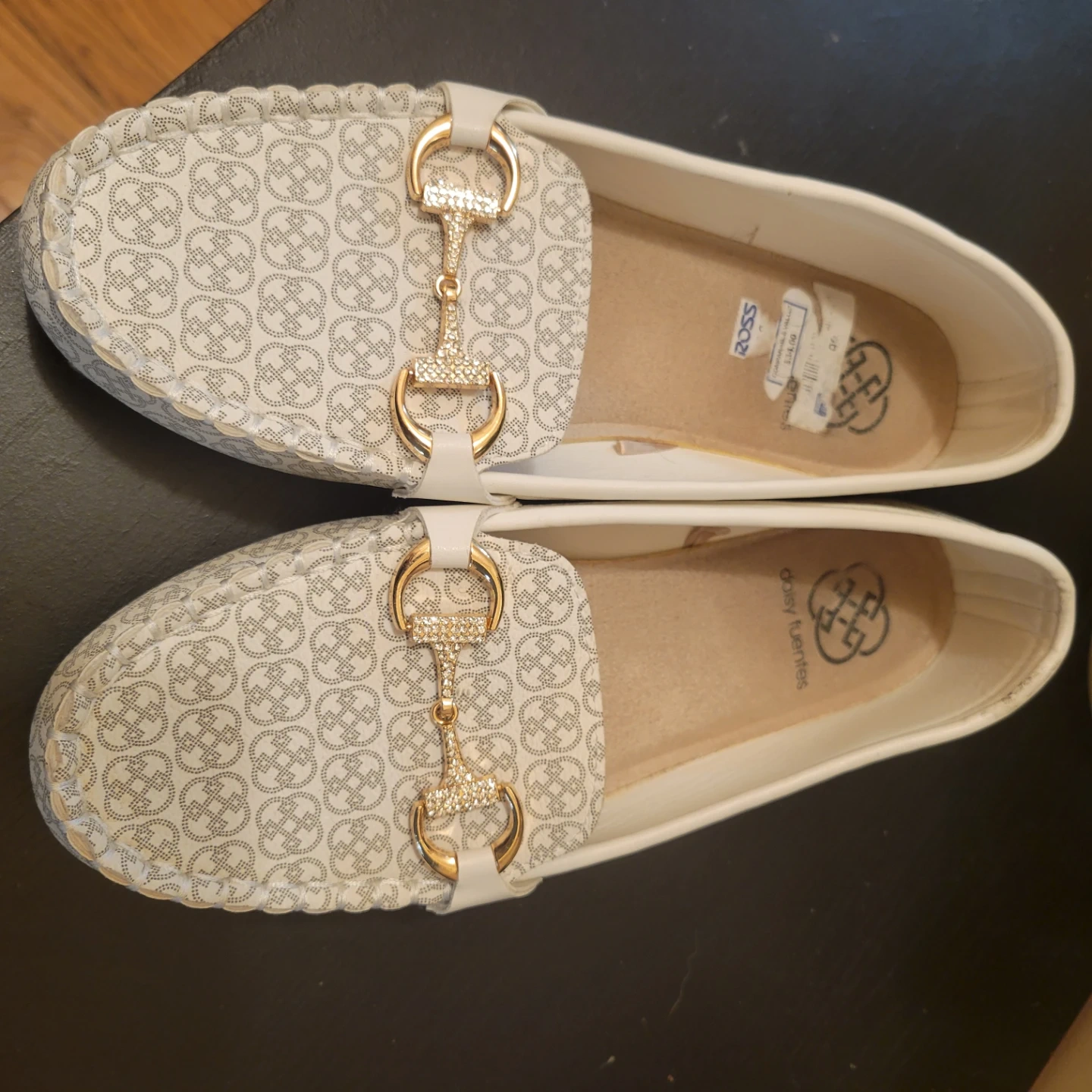 These Daisy Fuentes loafers feature a white and grey monogram pattern with gold and crystal embellishments. They're comfortable slip-on shoes with a classic moccasin toe. These shoes are a 7.5