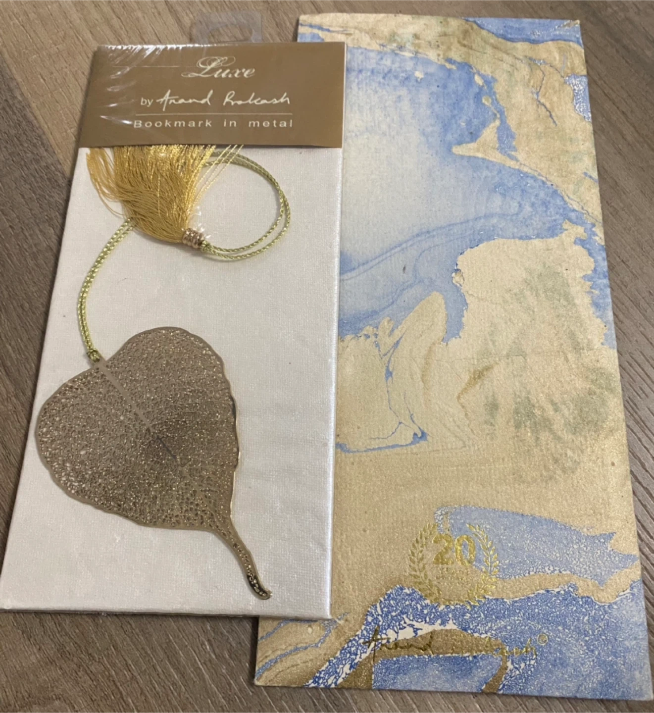 This is a Luxe by Anand Rokash bookmark in metal. It features a gold-toned leaf design with a matching tassel. A beautiful and elegant addition for any book lover's collection!