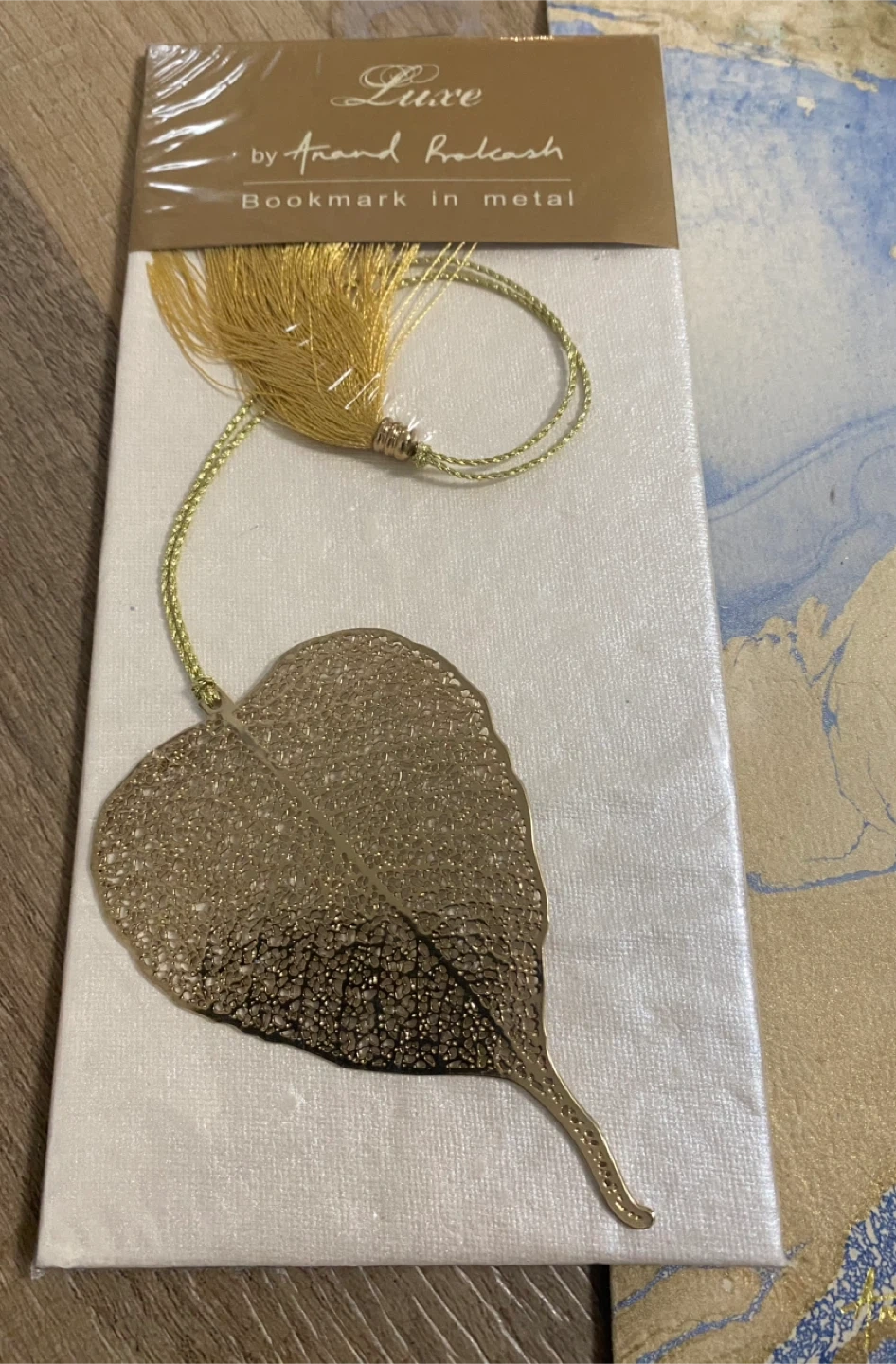 This is a Luxe by Anand Rokash bookmark in metal. It features a gold-toned leaf design with a matching tassel. A beautiful and elegant addition for any book lover's collection!