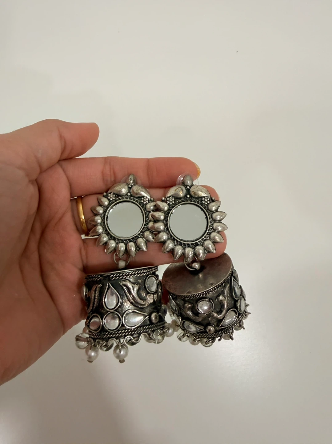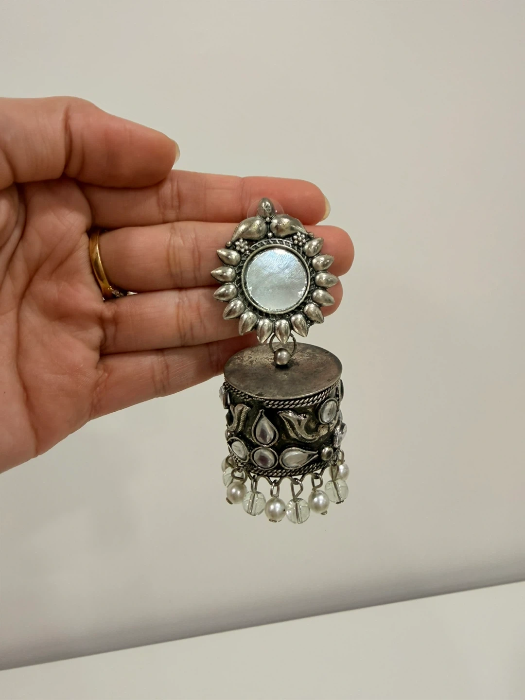 Sliver jhumka earrings featuring a central mirror and intricate detailing. These earrings have clear stones and small pearl drops. They're designed to add a touch of elegance to any outfit.