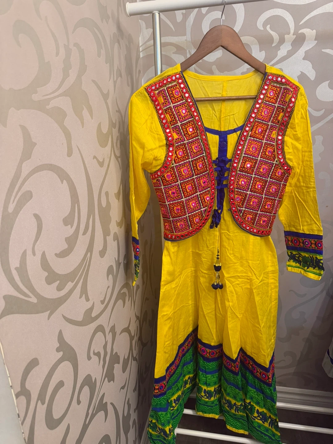 Bright yellow kurti featuring a colourful embroidered vest adorned with mirror work. The vest has a blue tie-up closure. It's embellished with vibrant patterns and tassels. Perfect for festive occasions!