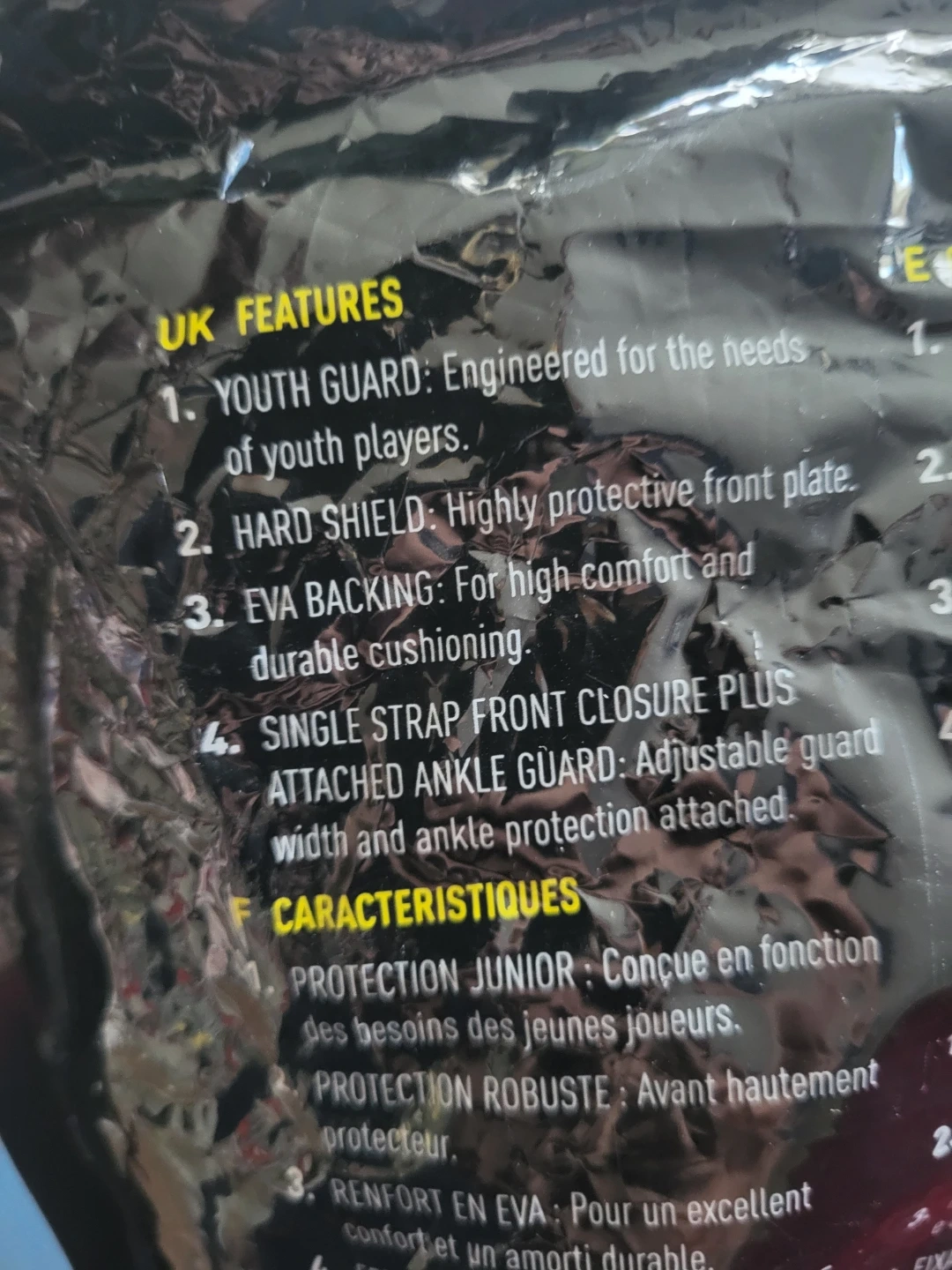 Youth football shin guards with a highly protective front plate and EVA backing for comfort. They feature an adjustable guard width and attached ankle protection. Suitable for youth players needing durable cushioning.