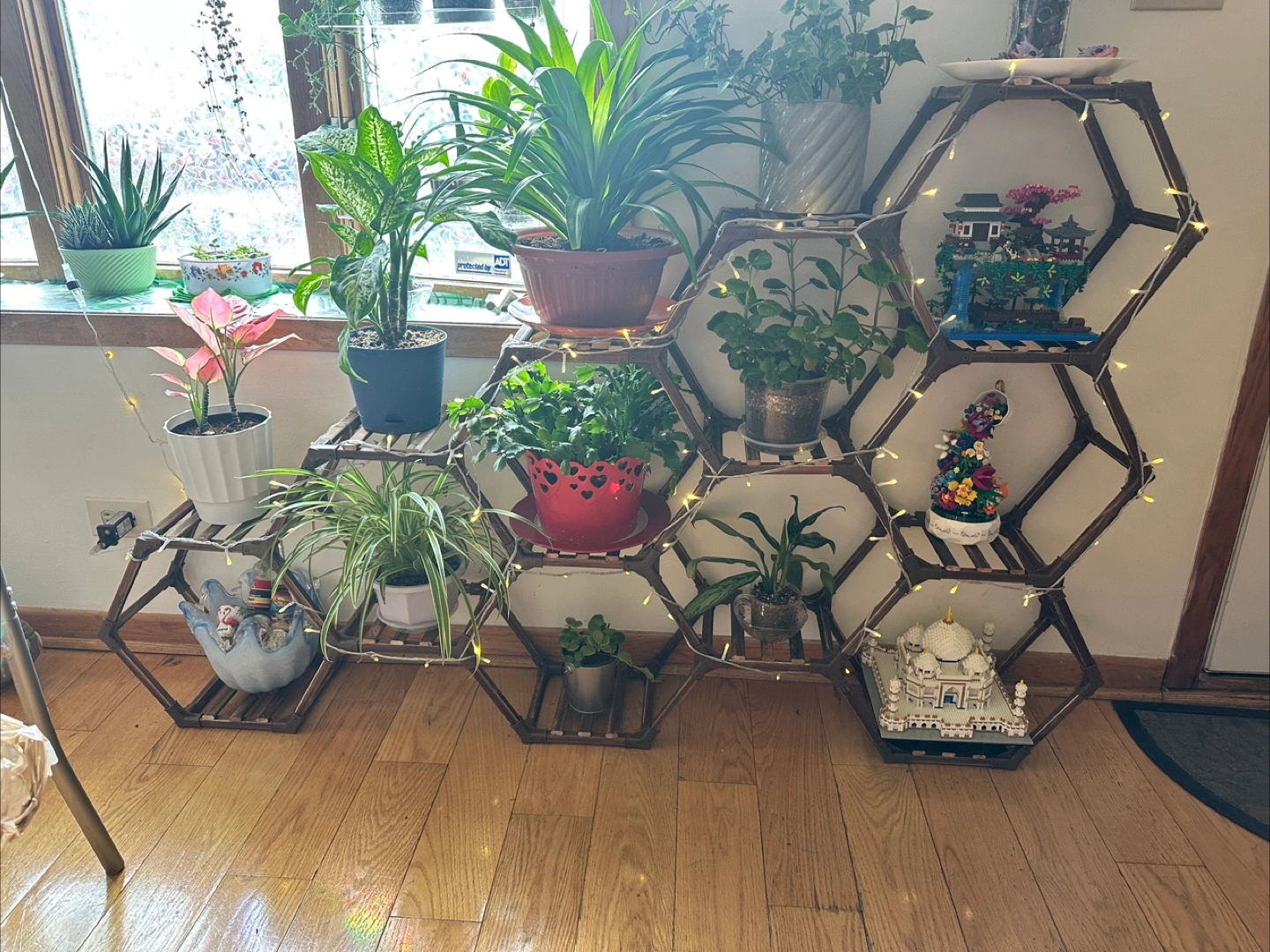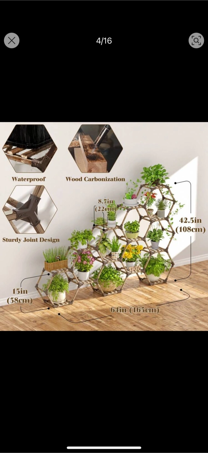 14 tier plant stand. Wooden hexagon shelves. Sturdy construction. Waterproof and carbonized wood. Perfect for indoor plants. Measures 42.5in tall, 64in wide, and 8.7in deep.