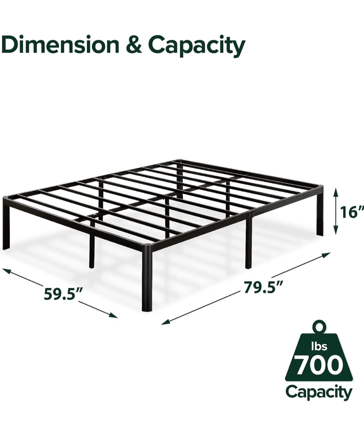 10Selling a Zinus 16" SmartBase mattress foundation in queen size! It's a sturdy and reliable base for your mattress. Key Features: - Dimensions: 59.5" x 79.5" x 16" - Weight capacity: 700 lbs