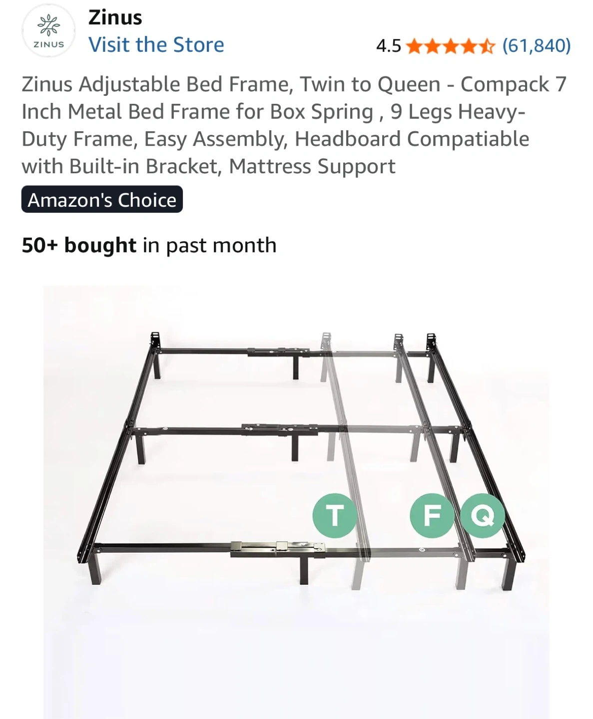 10Selling a Zinus adjustable bed frame, perfect for sizes ranging from twin to queen! It's a Compack 7-inch metal frame designed for use with a box spring. Features a 9-leg heavy-duty frame, easy assembly, and is headboard compatible with a built-in bracket for mattress support