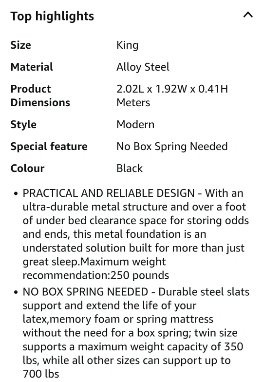 89Selling a Zinus King bed frame only (mattress not for sale), the 'Van' model with a 16-inch height. It's black and made of alloy steel. This platform bed frame features heavy-duty metal construction and steel slat support, so no box spring is needed! The dimensions are 2.02L x 1.92W x 0.41H meters. It also offers underbed storage. Assembled and ended up being way to high for me and never used. Disassembled, comes with assembly instructions, all screws, washers and tools. Bought on Amazon for $175. Selling for $100 firm. Pick up only in Yaletown. No delivery. Cash or etransfer only.