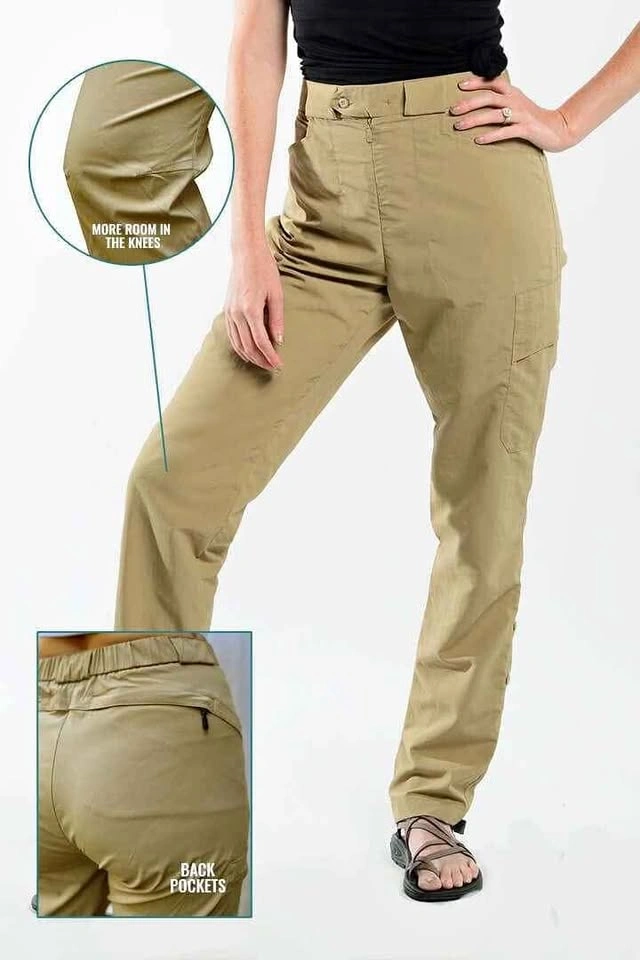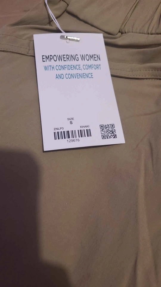 Size small but fits more like a medium. Good for hiking, camping, fishing etc. Allows women to go with pants pulled up they unzip from front waist band to back. New tried on only still has tags on