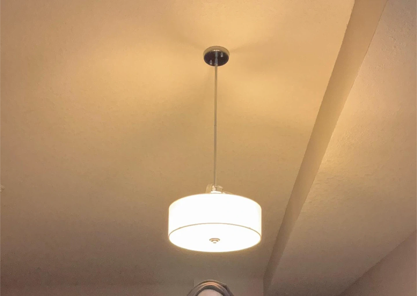 Beautiful contemporary hanging ceiling light featuring a white fabric drum shade and chrome detailing. Provides a soft, warm glow—perfect for dining areas, living rooms, or bedrooms.