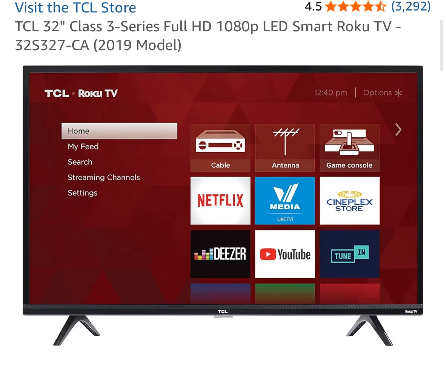 TCL 32 inch 3-Series Roku Smart TV. Full HD 1080p resolution.