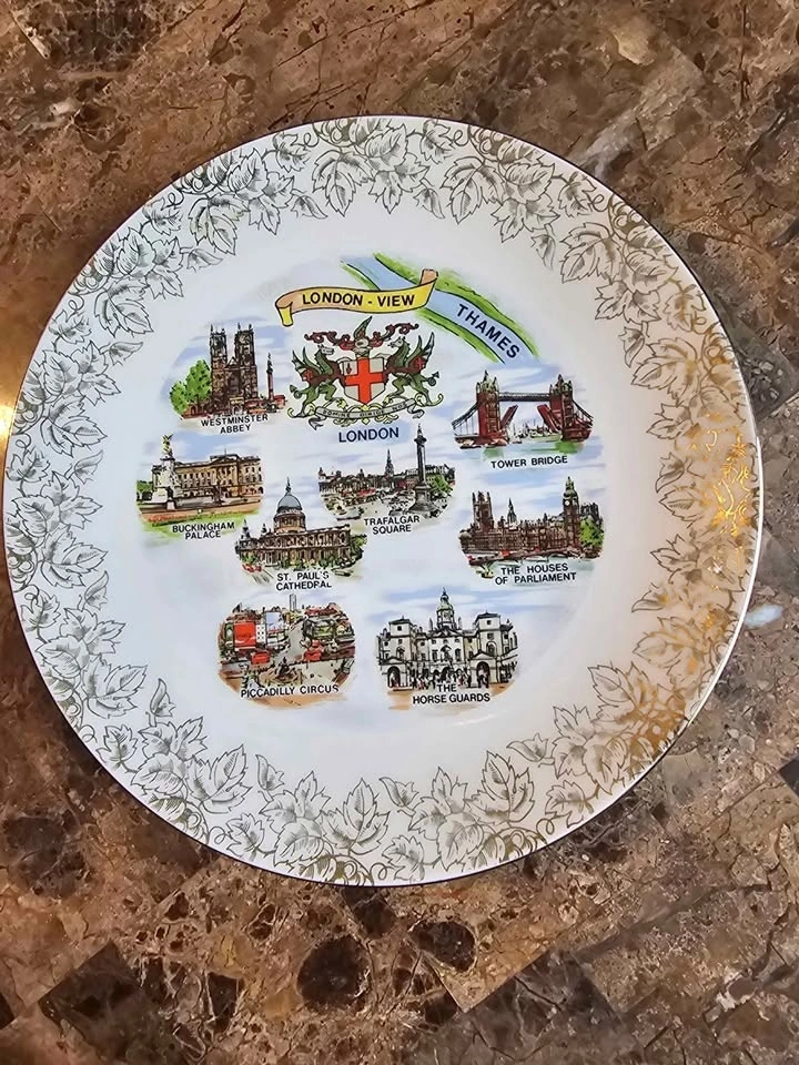 Selling a decorative plate featuring London landmarks such as Westminster Abbey, Buckingham Palace, and Tower Bridge. It's a lovely piece to add to any collection or as a souvenir of London.