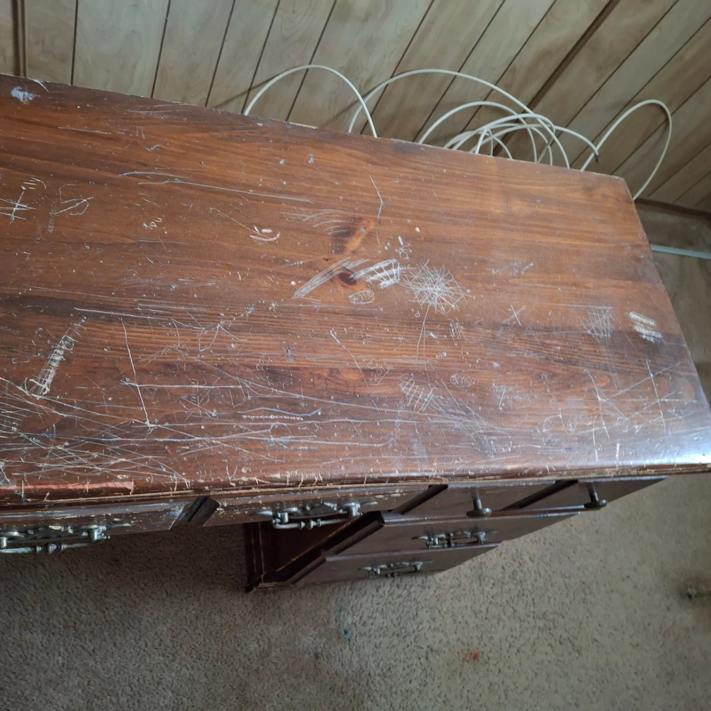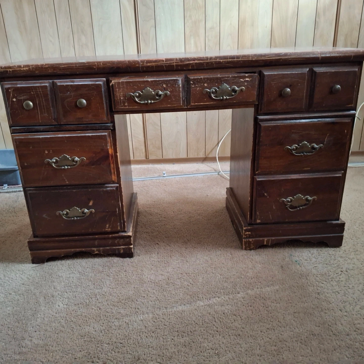This is a dark wood desk with a total of nine drawers. It has a classic design with brass-toned drawer pulls. The desk shows signs of wear, including scratches on the top and some minor damage to one of the drawer fronts-- see photos Has some carvings but overall solid