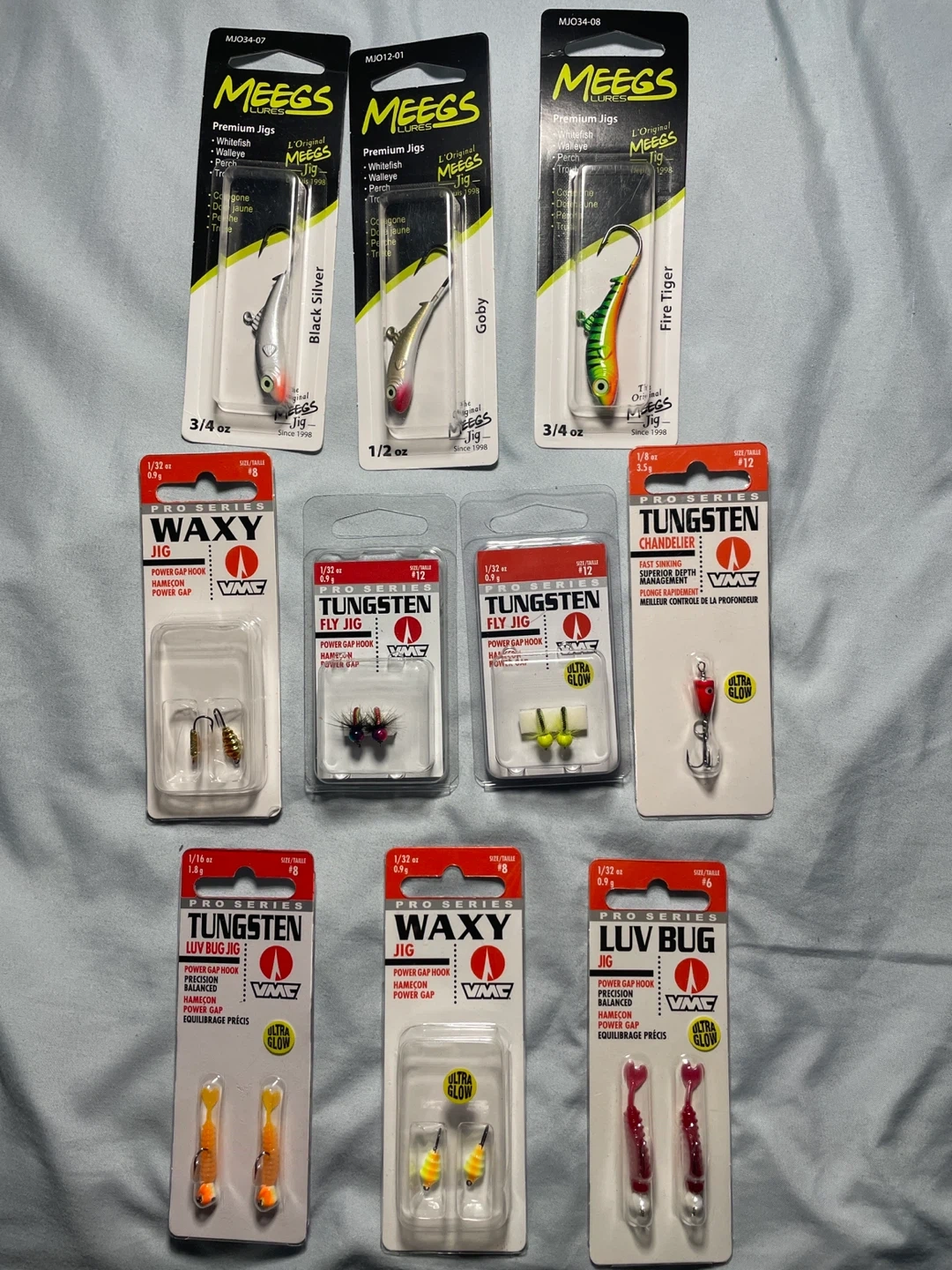 Assorted fishing jigs from MEEGS. Includes Premium Jigs, Tungsten Fly Jigs, Waxy Jigs, and Luv Bug Jigs. Many feature Ultra Glow for added visibility. Various sizes and weights are included.