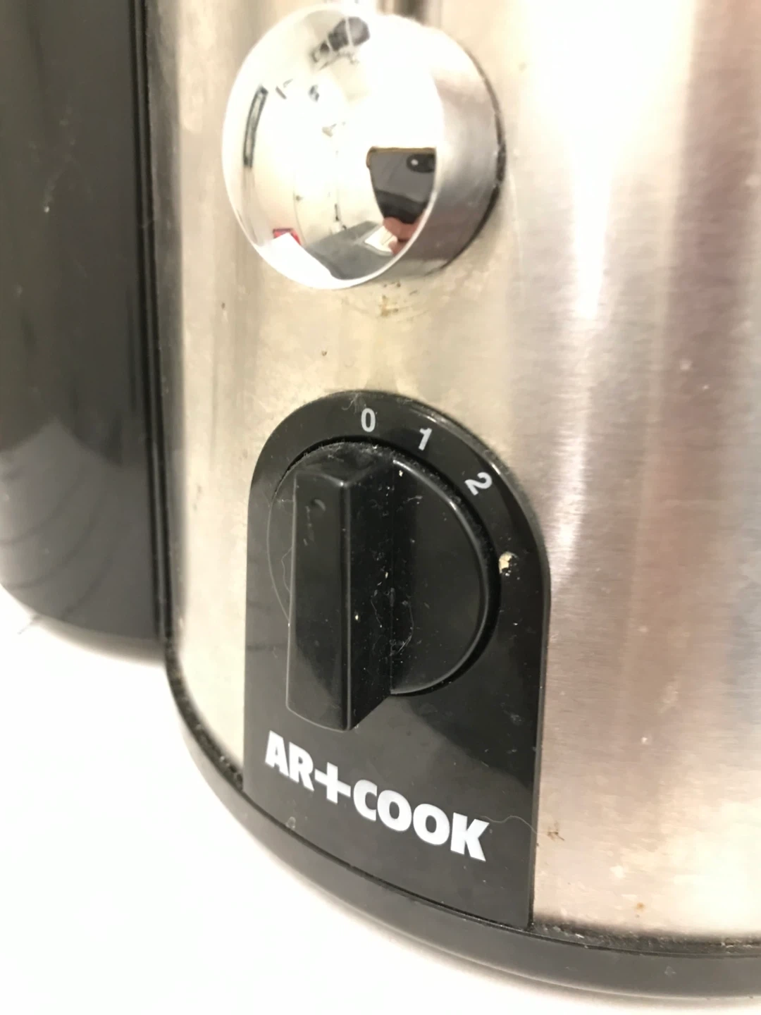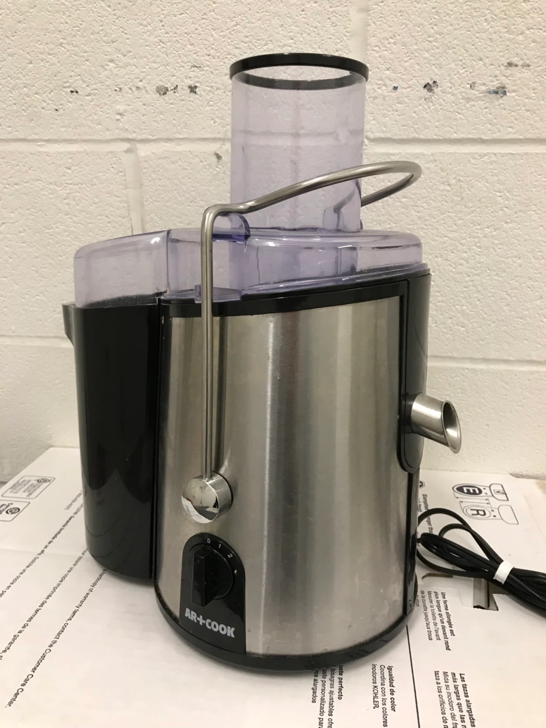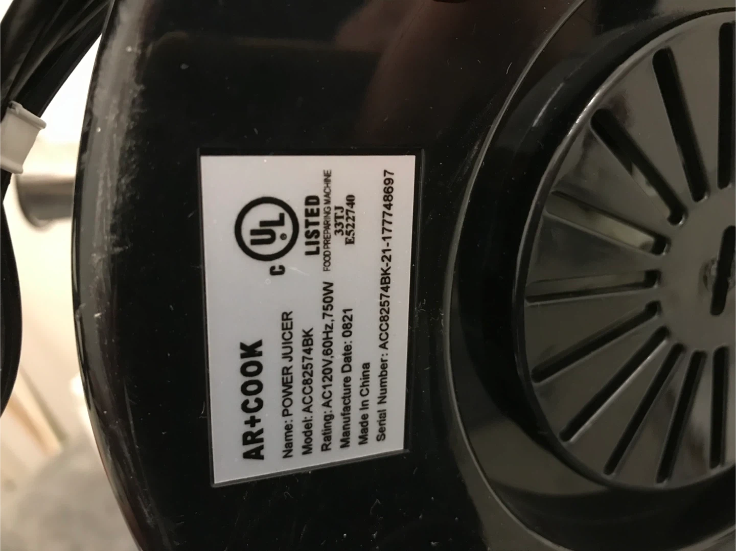 This AR+COOK power juicer is a food preparing machine. It runs on 120V AC and is 60Hz with a 750W rating.