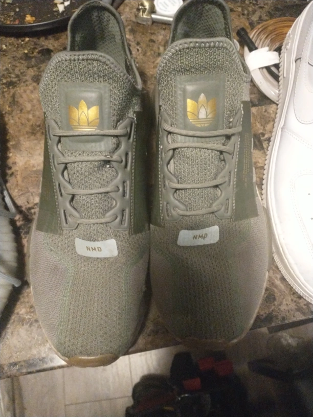 Selling a pair of Adidas NMD sneakers in olive green. They're in good condition and ready for a new home!