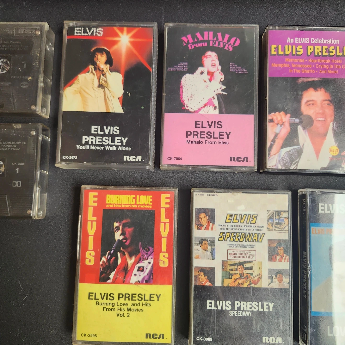 Collection of Elvis Presley cassette tapes. Includes 'You'll Never Walk Alone', 'Mahalo From Elvis', 'Greatest Jukebox Hits', 'Burning Love and Hits From His Movies Vol. 2', 'Speedway', and 'Loving You'. Some tapes are from RCA. Condition varies.