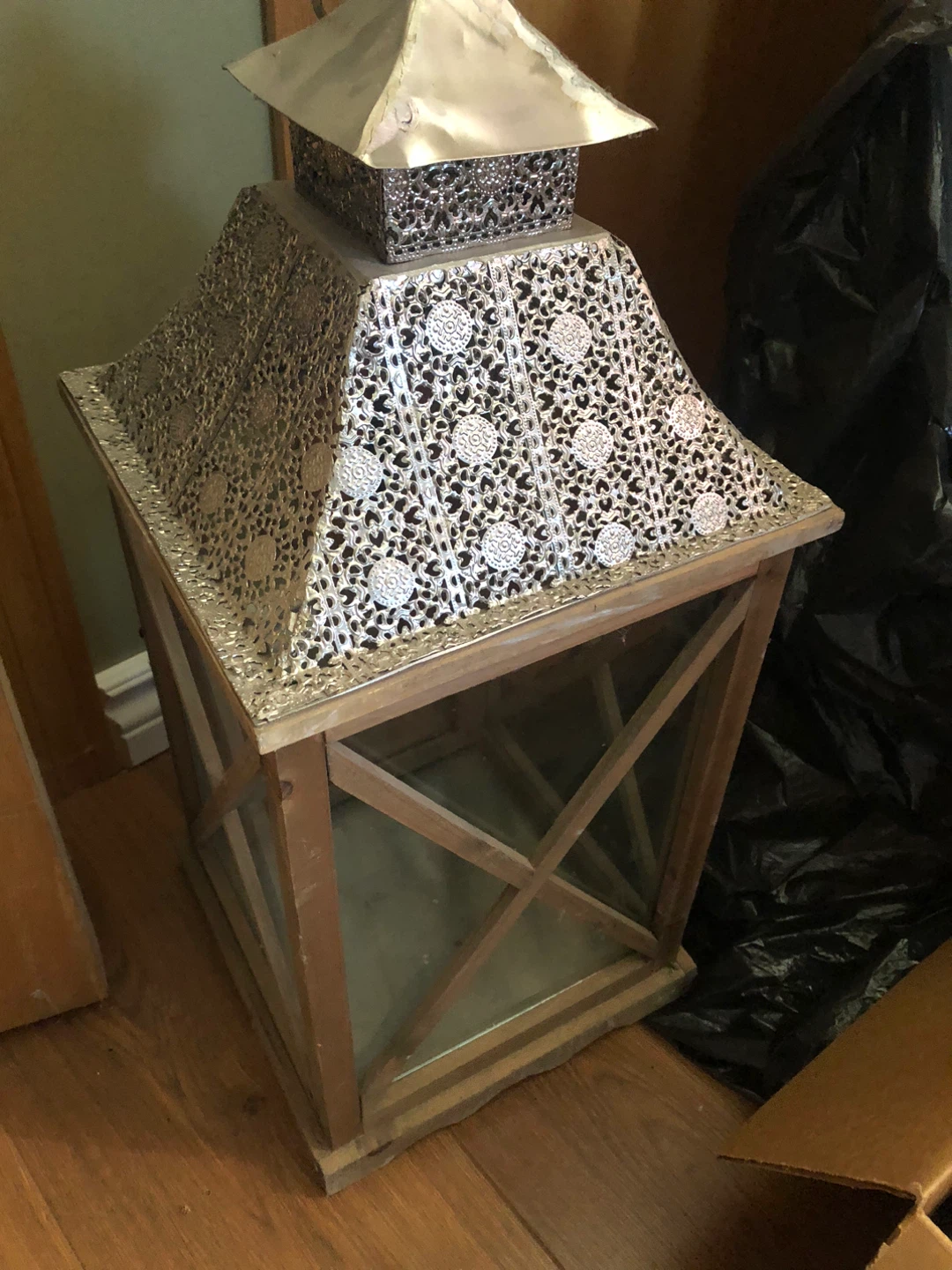 This is a lantern that you buy at HomeSense to give your home a homey touch. It’s about 2 feet tall and 1 foot wide and has a little door so you can put an electric candle in it to make it give some light to the room. Price is firm.