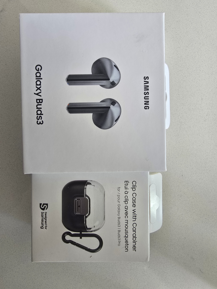 Selling a pair of Samsung Galaxy Buds3, complete with the original box. Also included is a clip case with carabiner, designed for Galaxy Buds3 and Buds3 Pro. Perfect for keeping your earbuds safe and secure on the go!