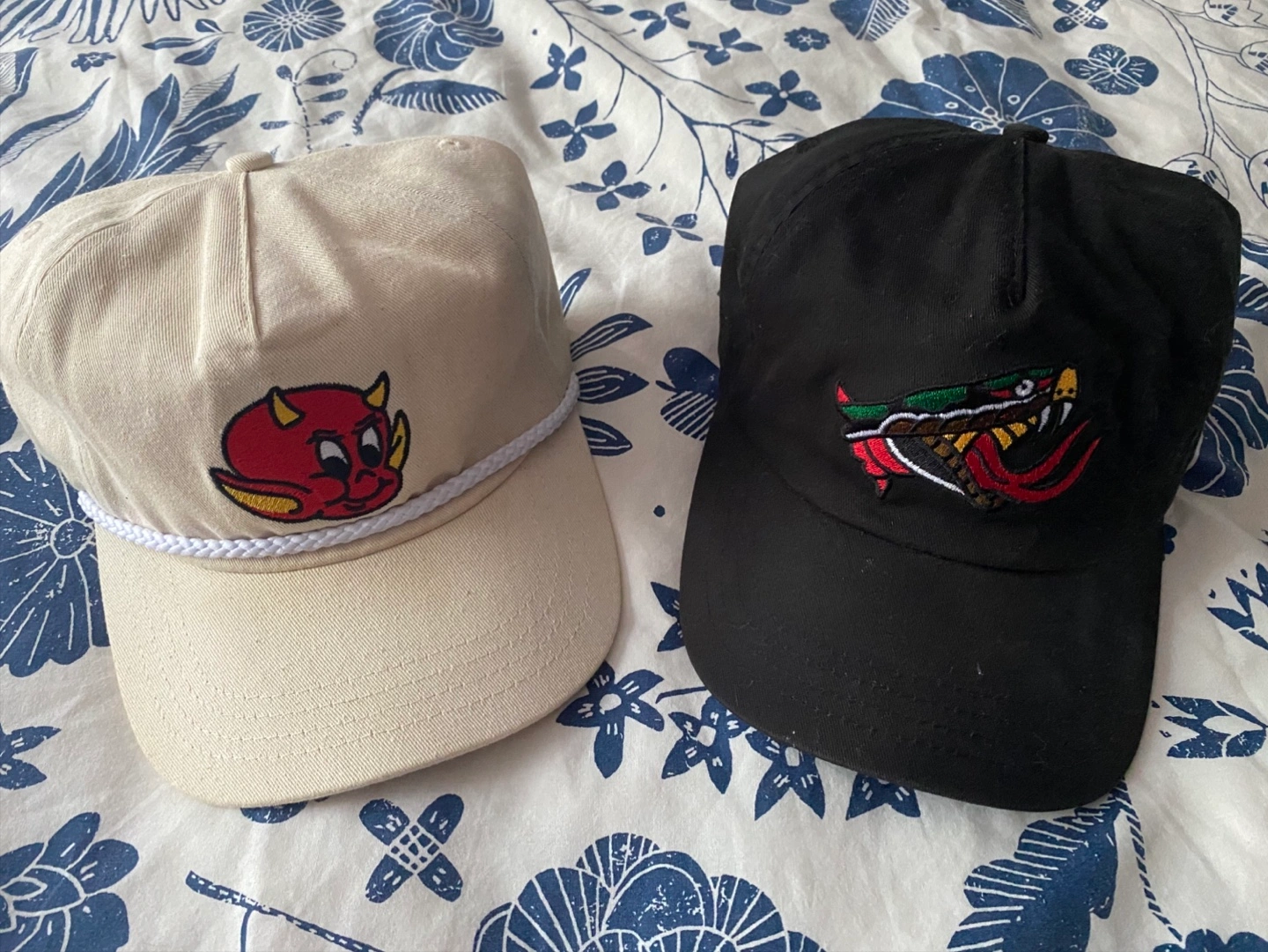 Selling two baseball caps in great condition. One is a beige/cream colour with a red devil design, and the other is black with a snake design. Both have "Indestructible" embroidered on the back. Perfect for adding some unique style to your wardrobe!