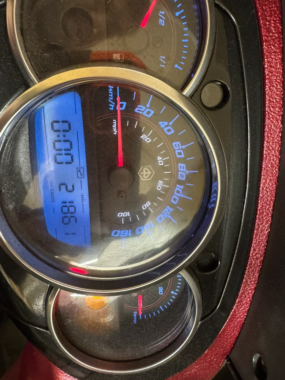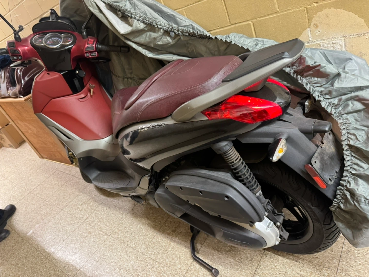 This is a Piaggio Beverly 350 scooter. It has a deep red and silver color scheme. The seat is a dark red leather.