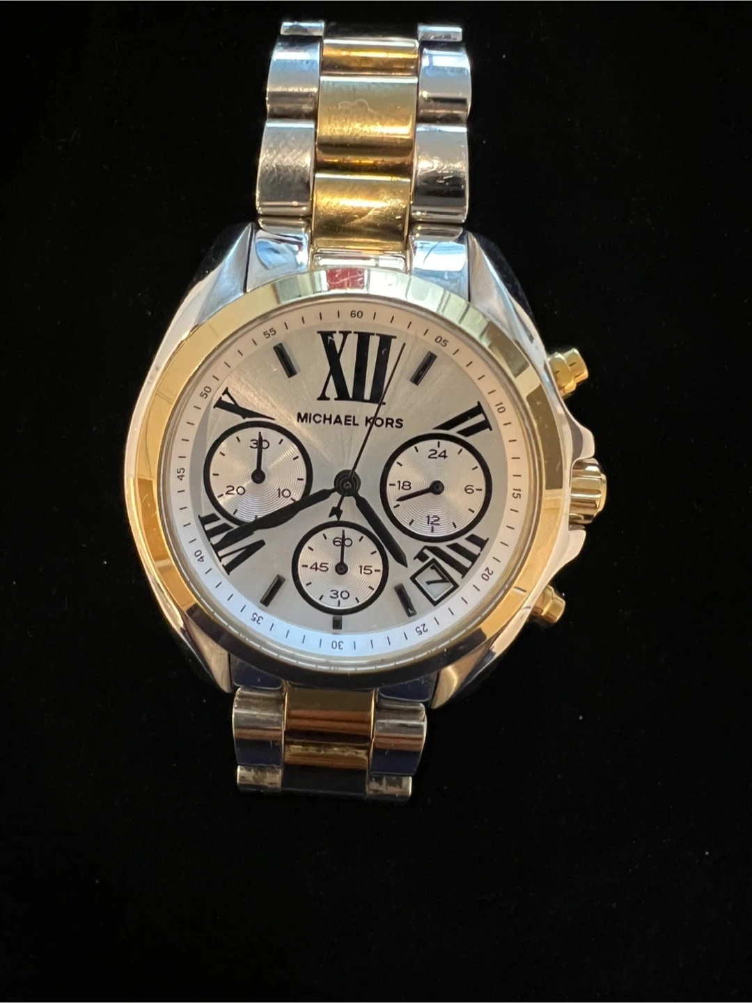 This is a Michael Kors chronograph watch with a two-tone stainless steel band. It features a silver dial with Roman numerals and three subdials. Water resistant up to 10 ATM. It's a stylish accessory for everyday wear.