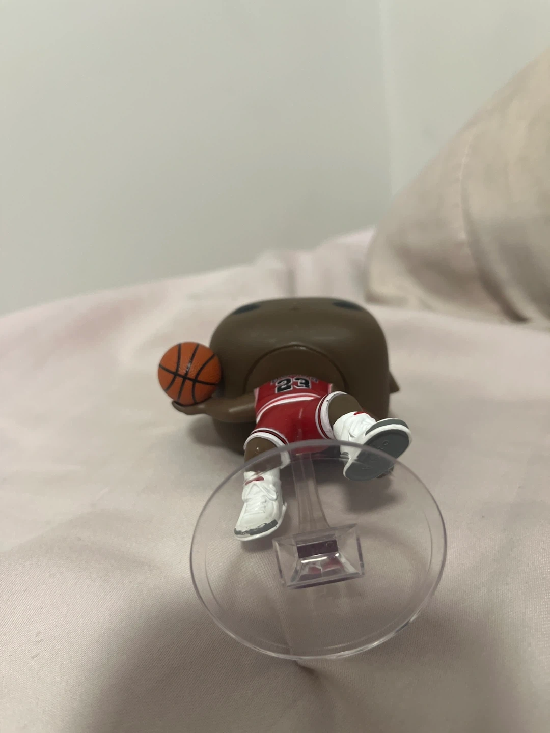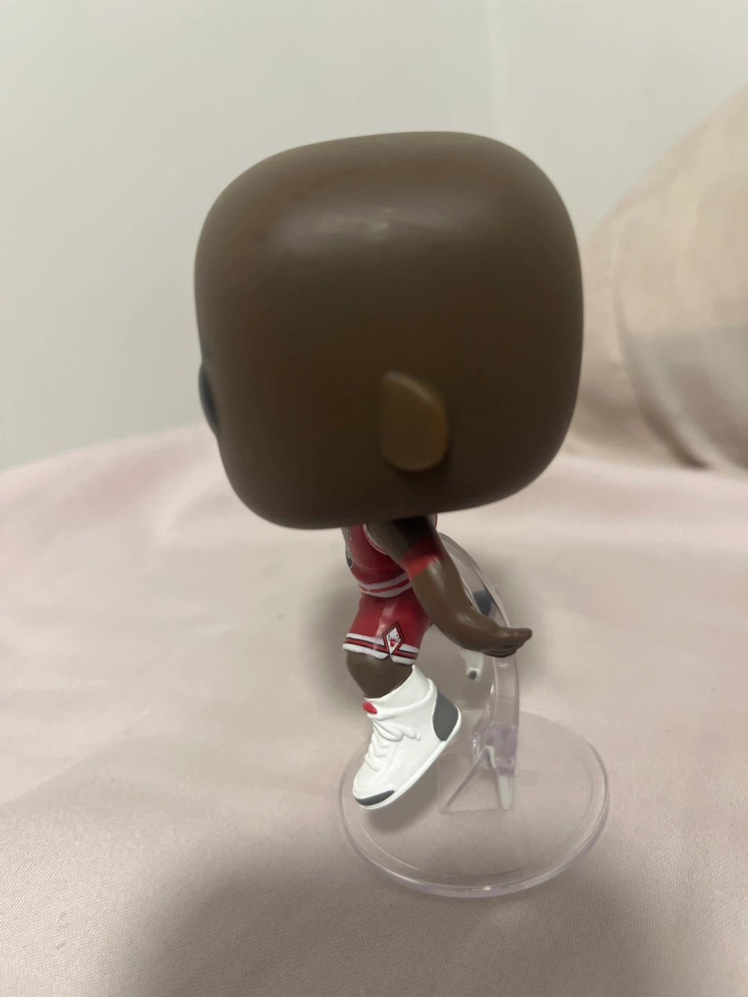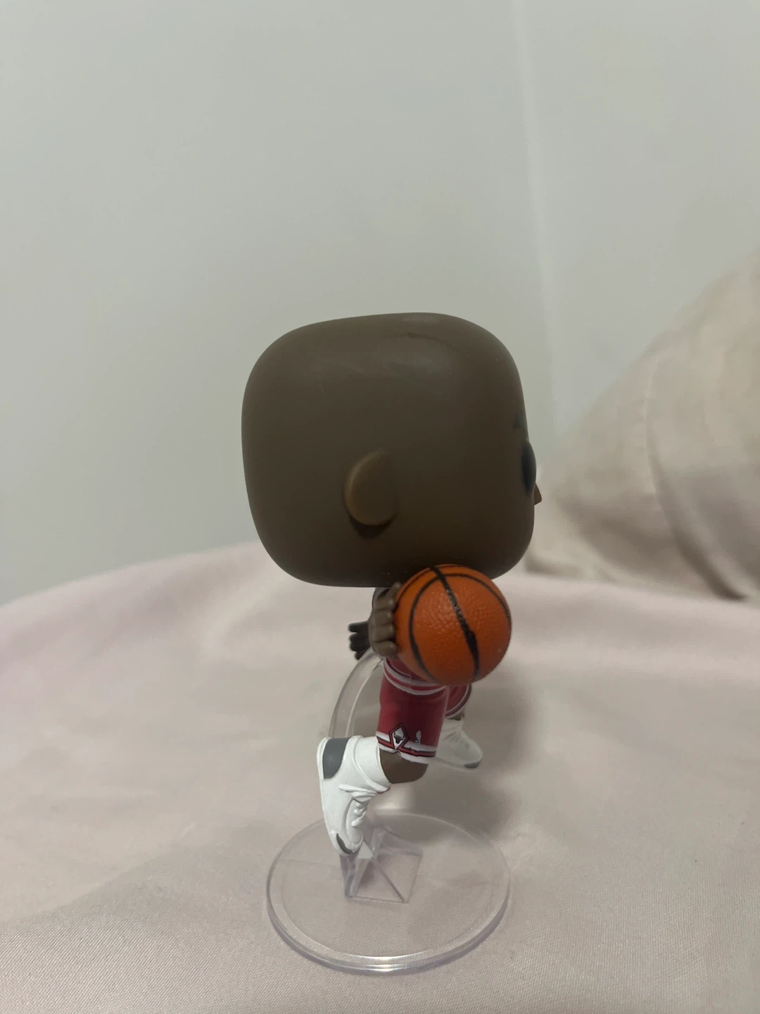 This is a Funko Pop! figure of Michael Jordan in his Chicago Bulls jersey, holding a basketball. It's mounted on a clear display stand. It's a great collectible for basketball fans!