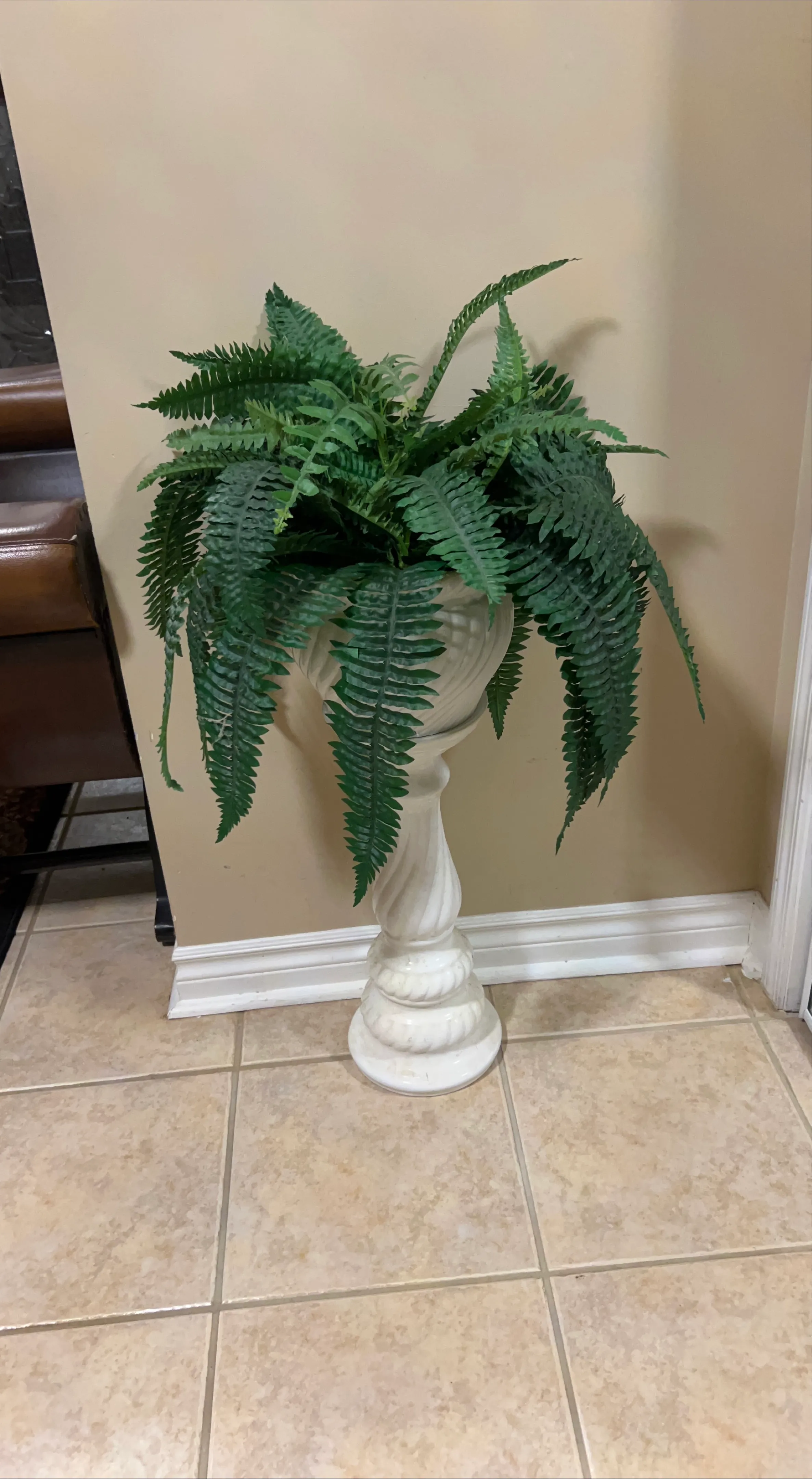 I'm selling an artificial fern plant in a decorative white urn. It's in great condition and would look lovely in any room of your home! It's a nice way to bring some greenery indoors without the upkeep of a real plant