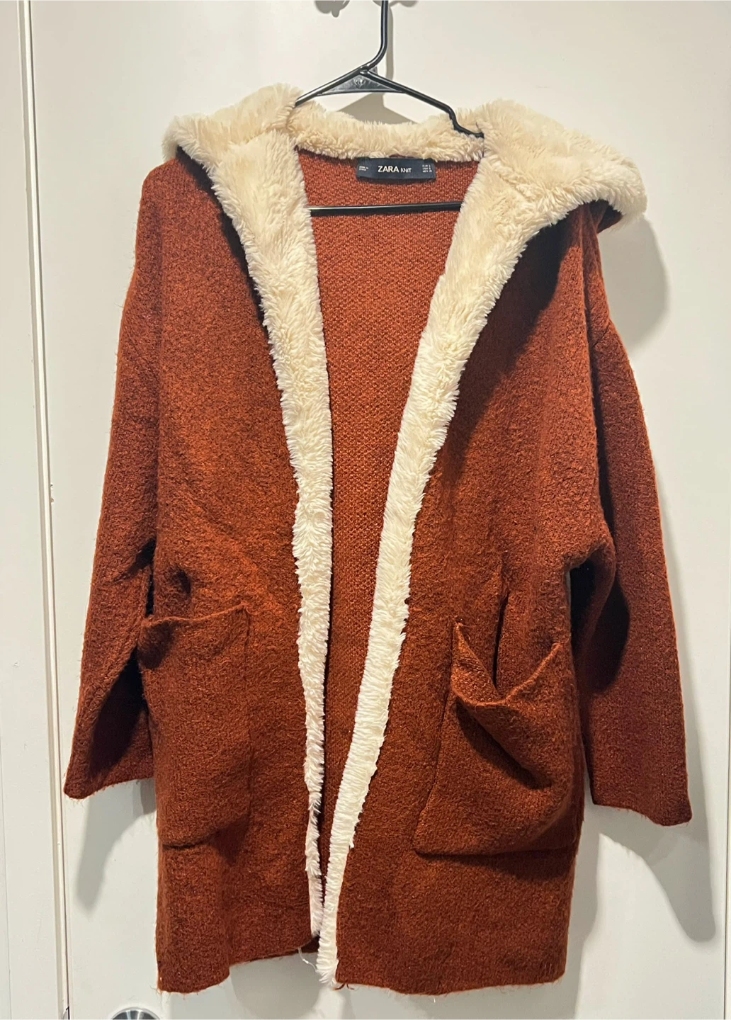 Cozy up in this stylish Zara knit cardigan! It features a lovely rust colour and a soft faux fur trim. Perfect for adding a touch of warmth and style to any outfit